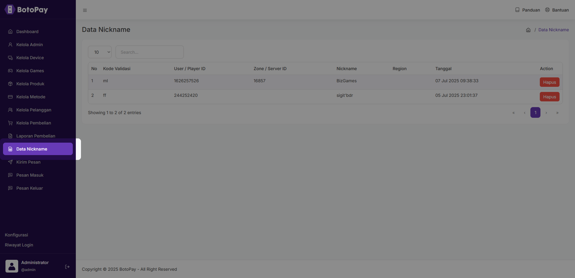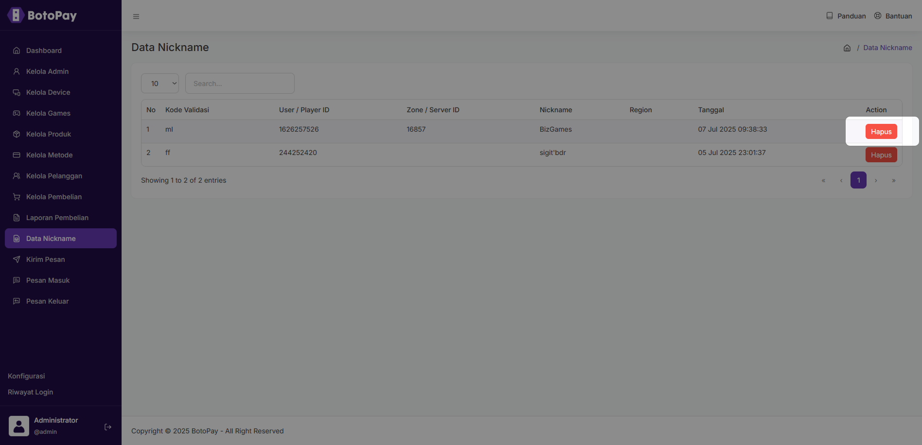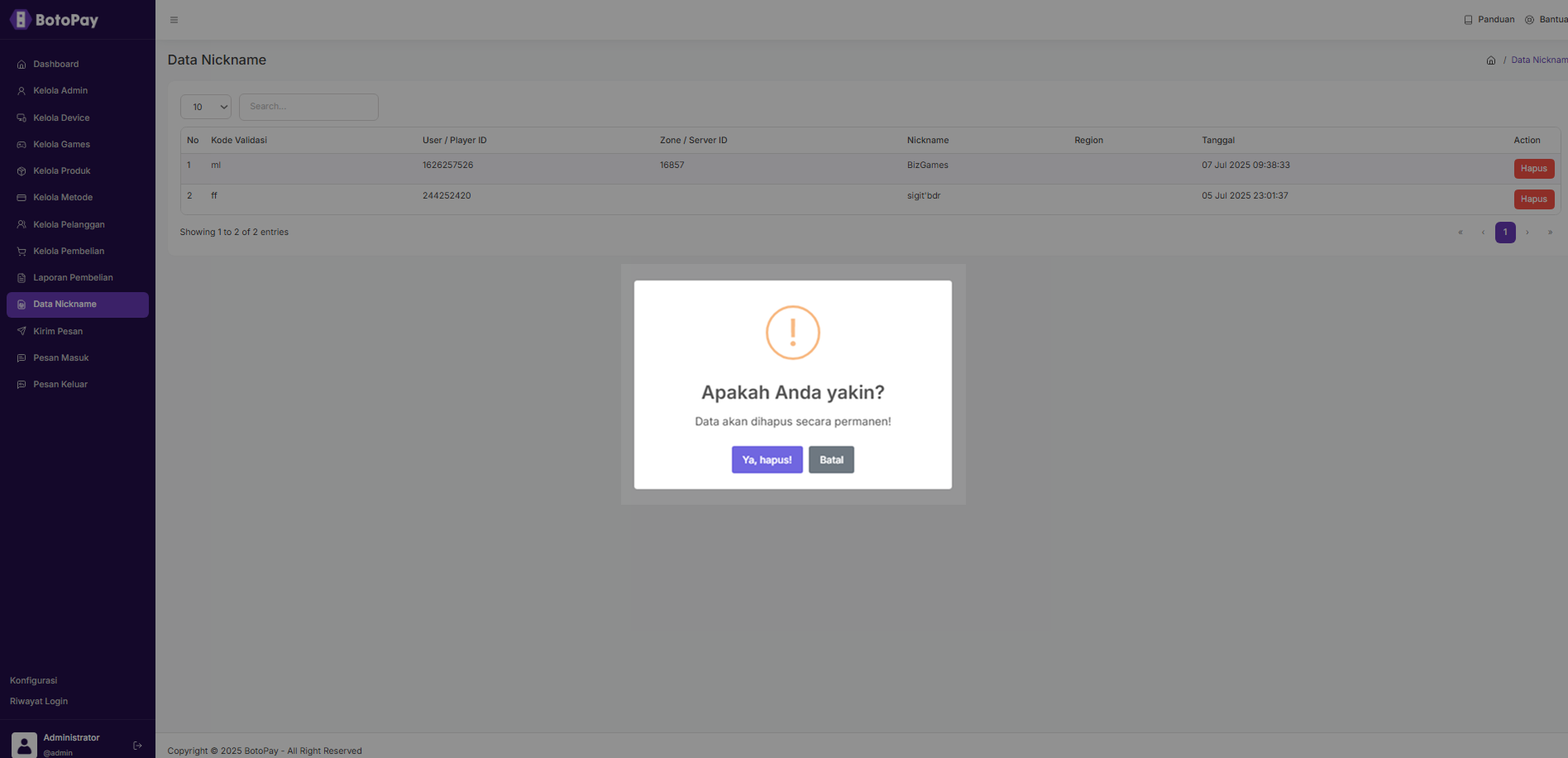 Berikut cara untuk menghapus data nickname : 1. Pada halaman dashboard admin, klik “Data Nickname”. 2. Klik “Hapus” pada kolom nickname yang ingin kamu hapus. 3. Klik “Ya, hapus!”.