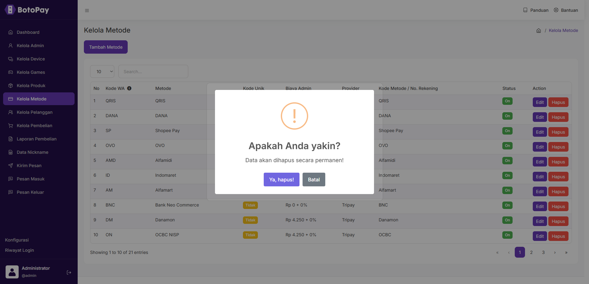 2. Klik “Hapus” pada kolom metode yang ingin kamu hapus.