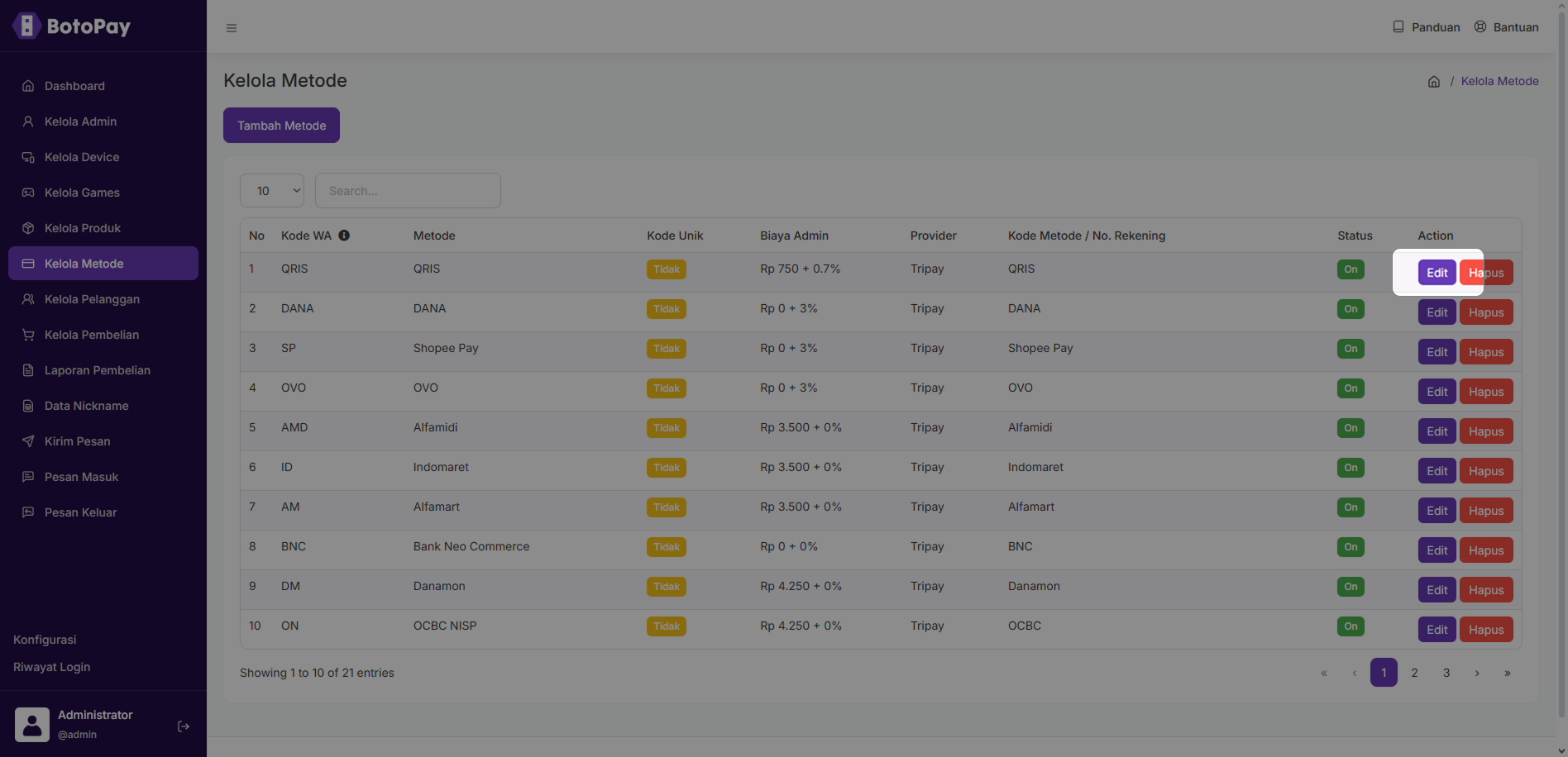 1. Pada halaman dashboard admin, klik “Kelola Metode”.