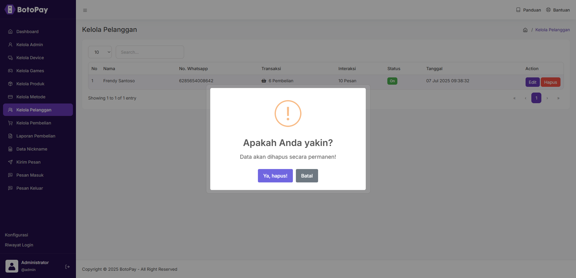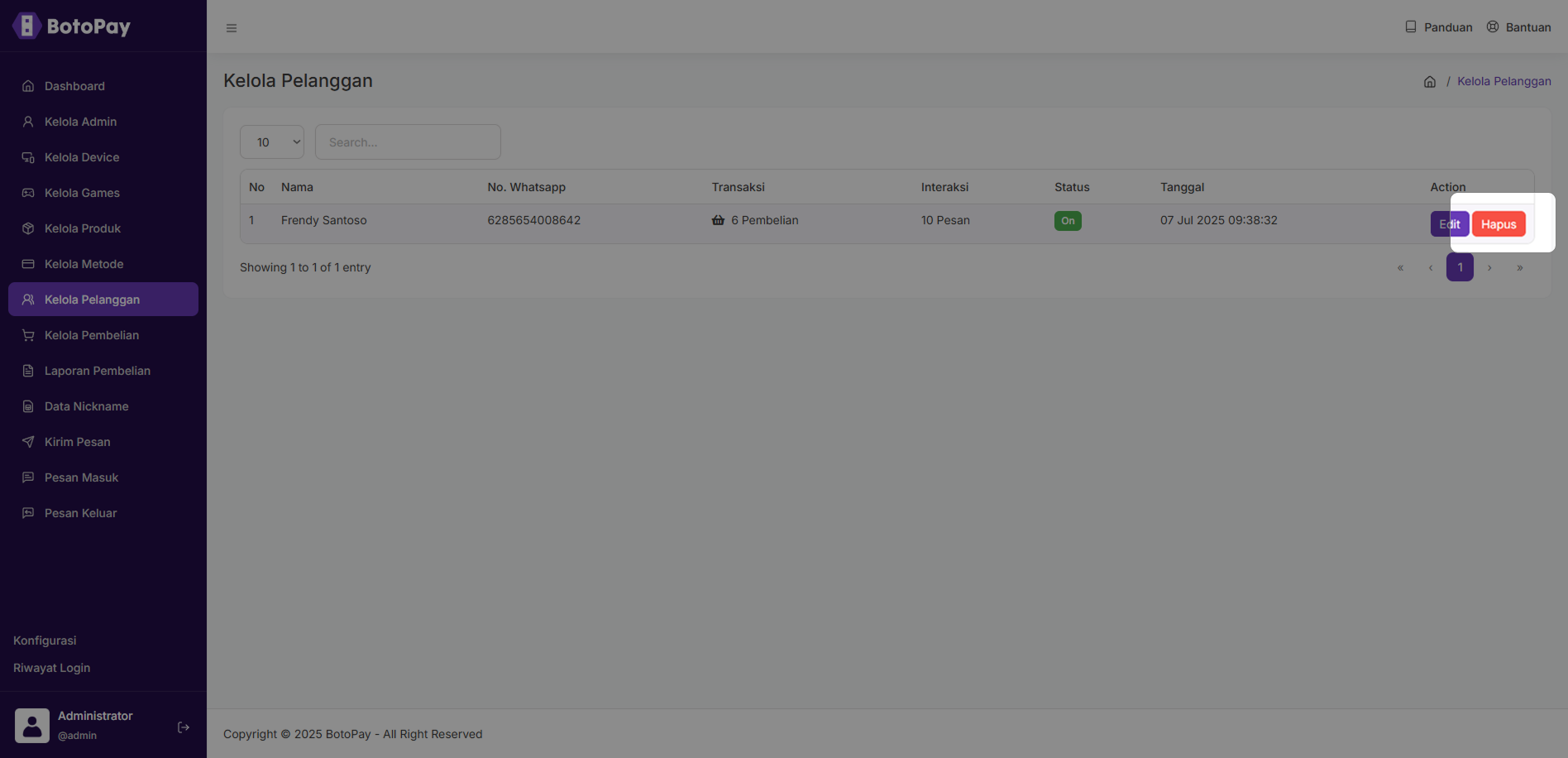2. Klik “Hapus” pada koom pelanggan yang ingin kamu hapus.