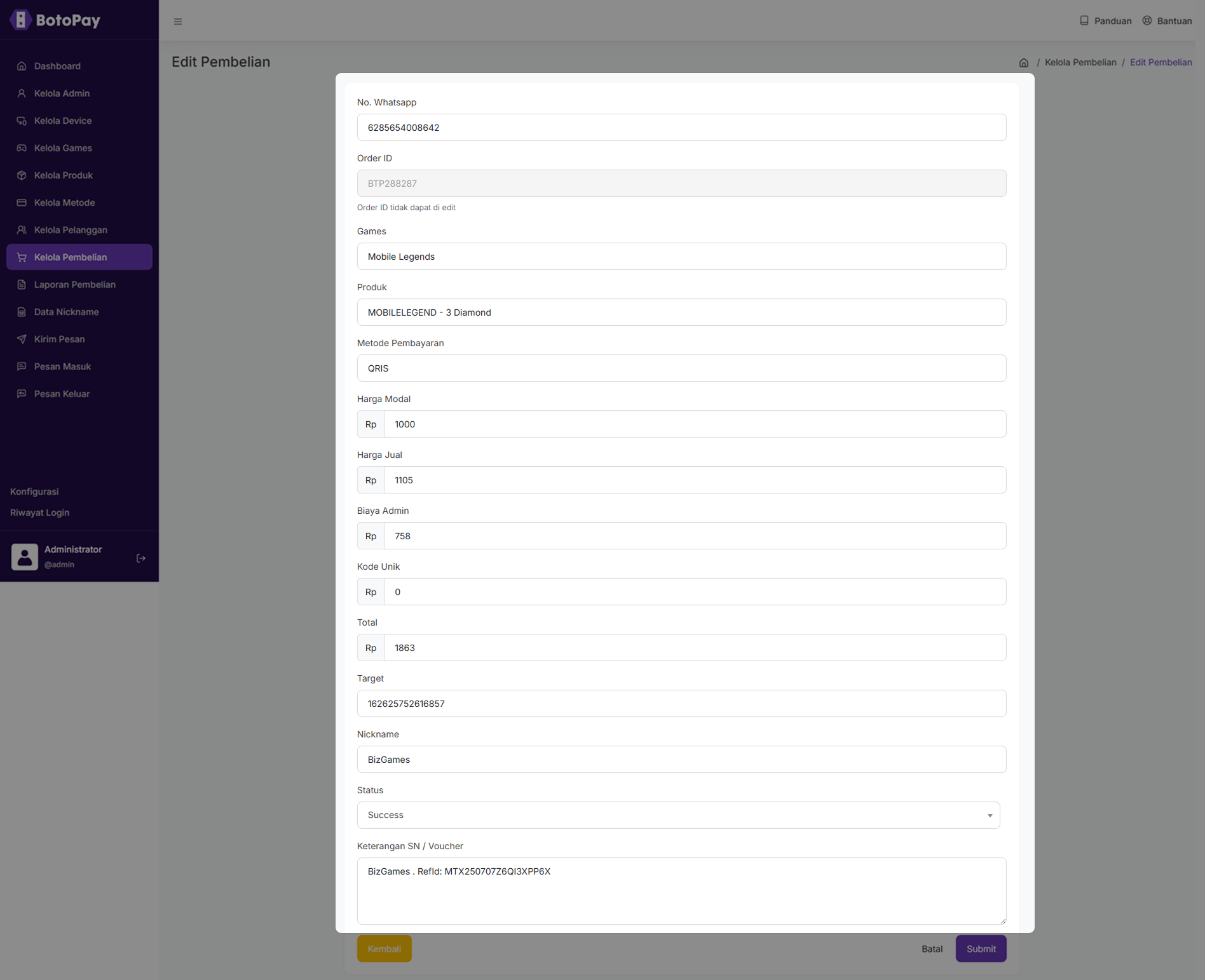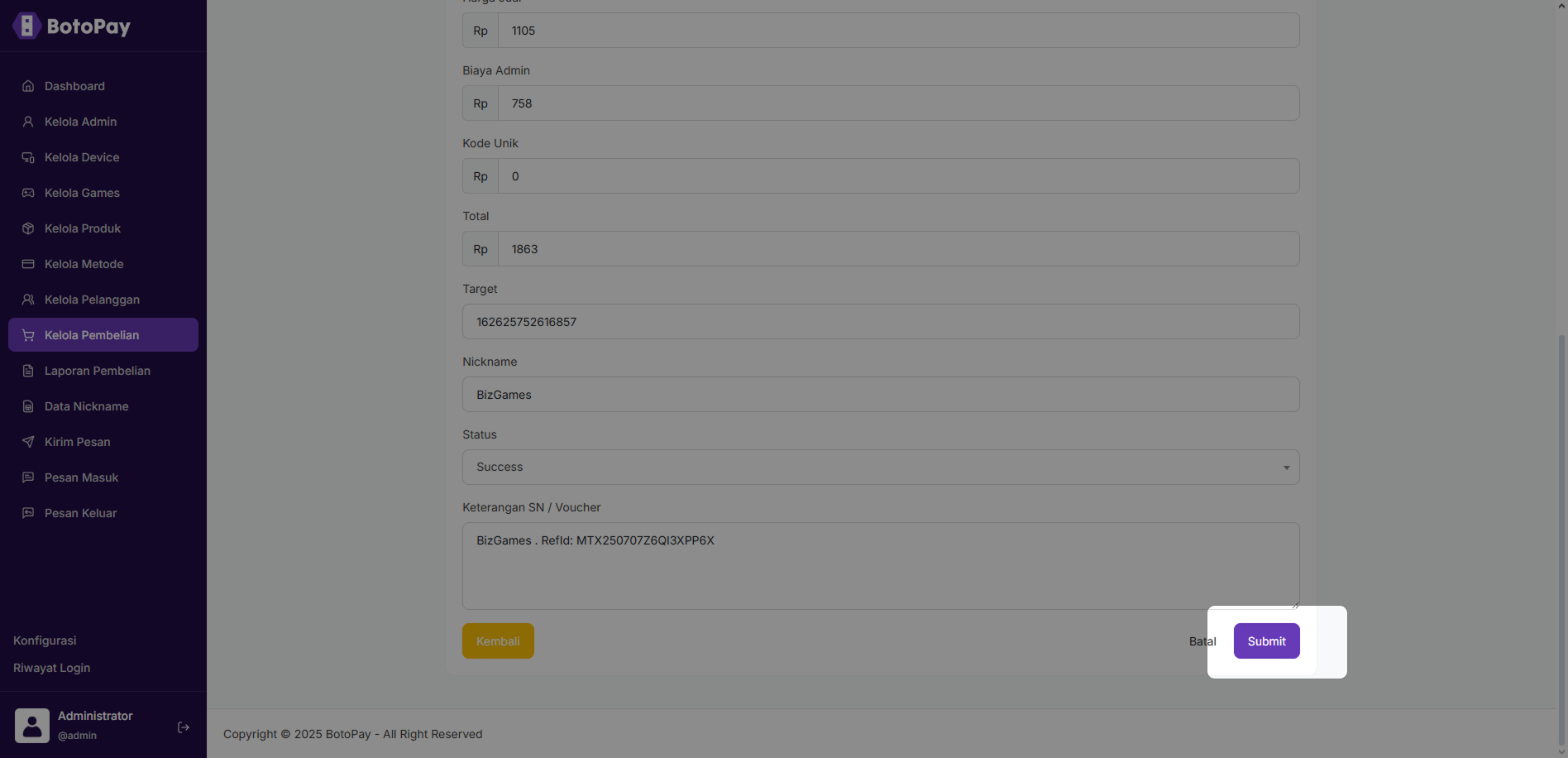 1. Pada halaman dashboard admin, klik “Kelola Pembelian”.