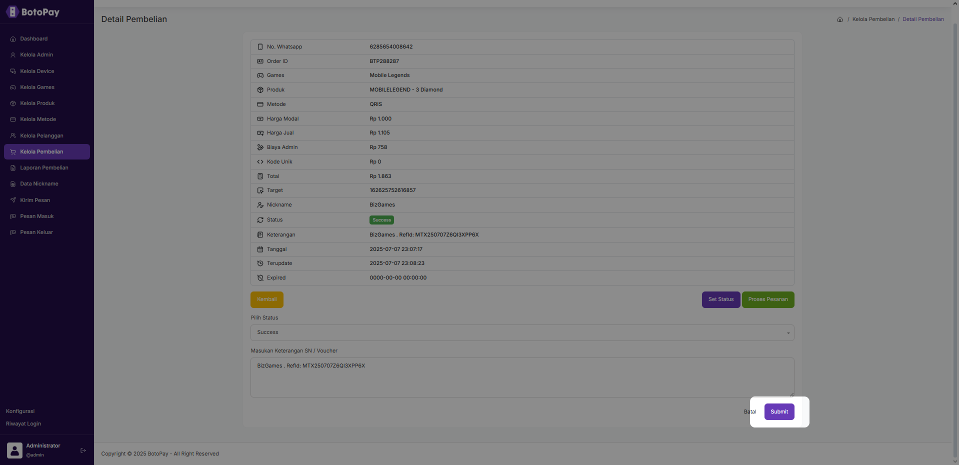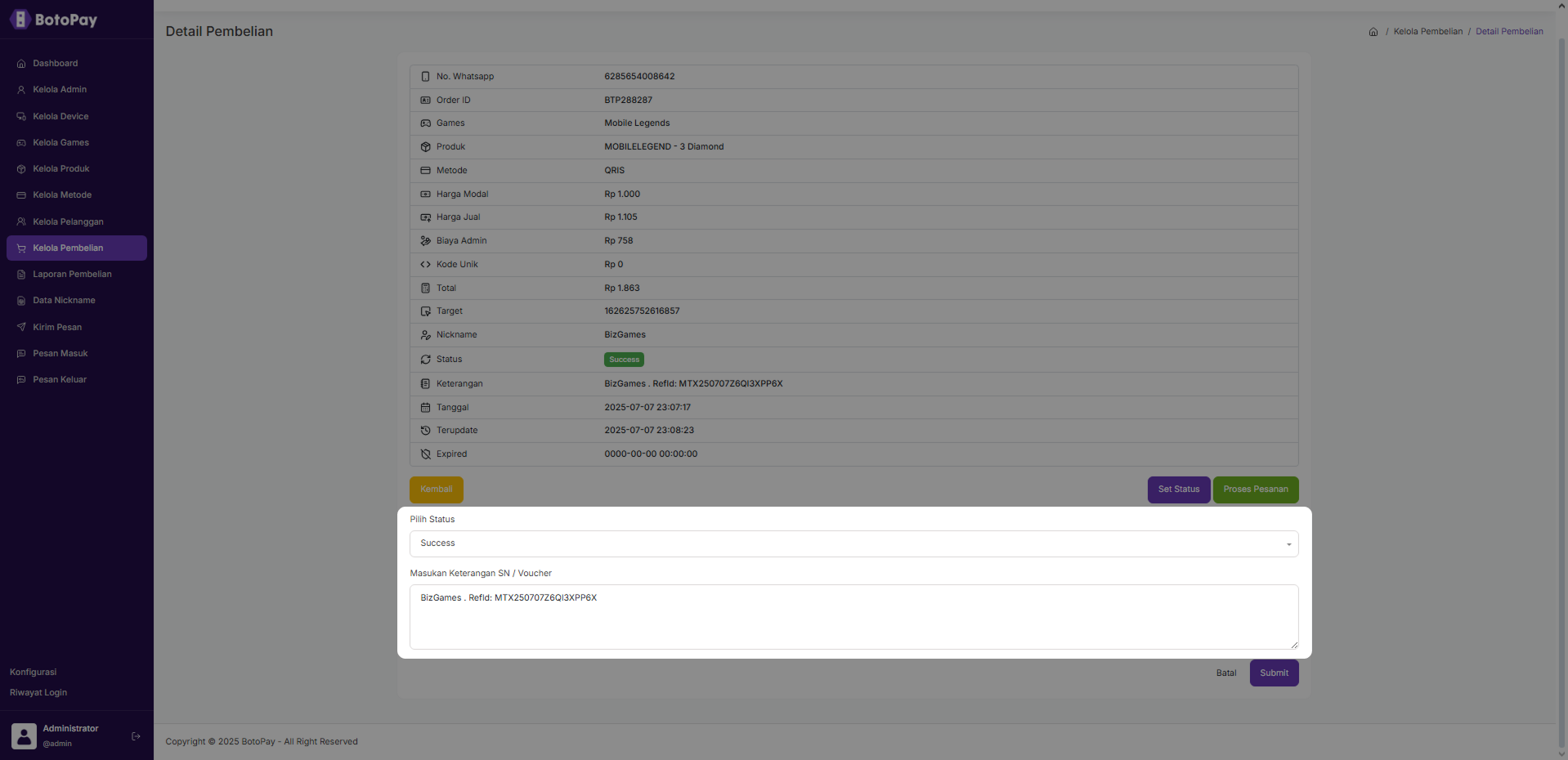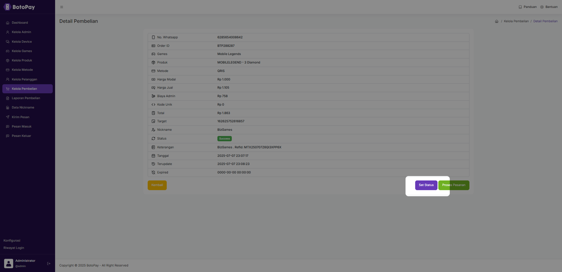 3. Klik “Set Status” jika kamu ingin set status pembelian.