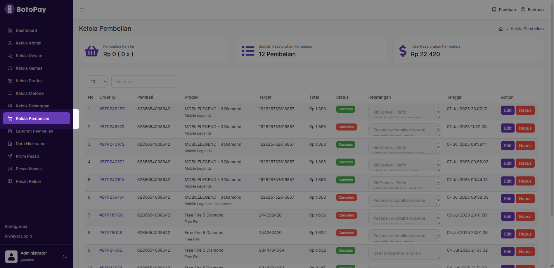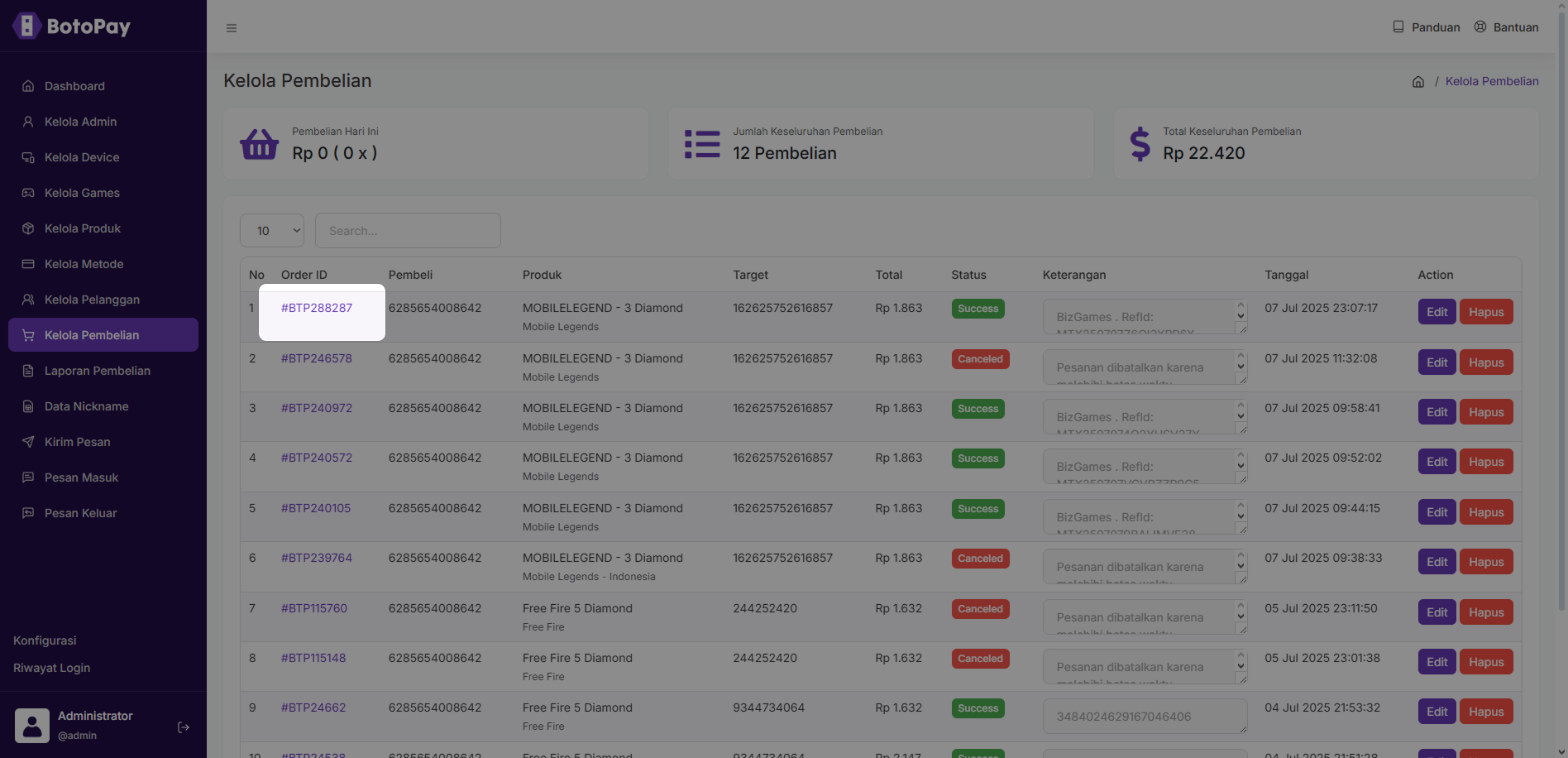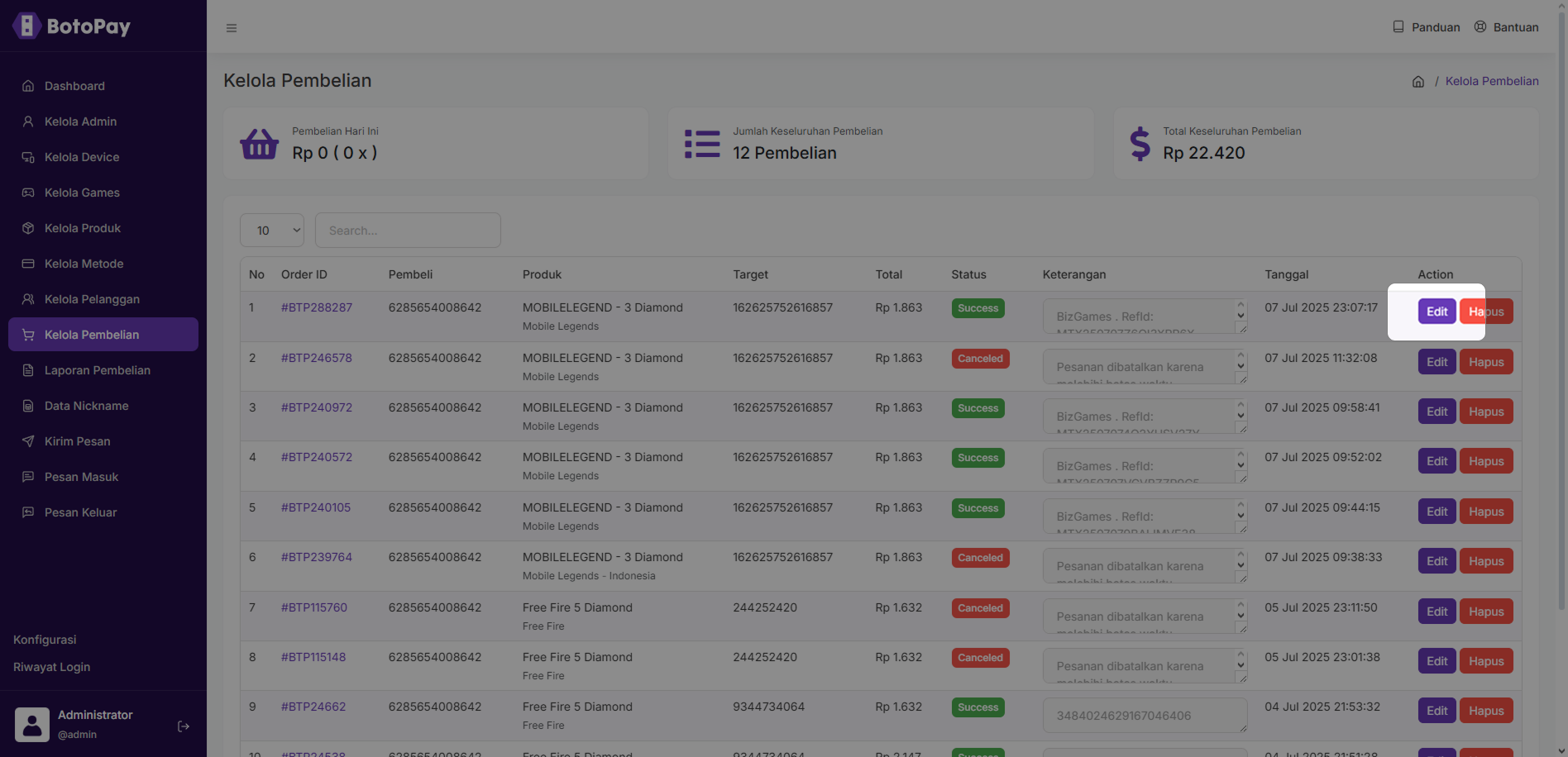 2. Klik “Edit” pada kolom pembelian yang ingin kamu edit.