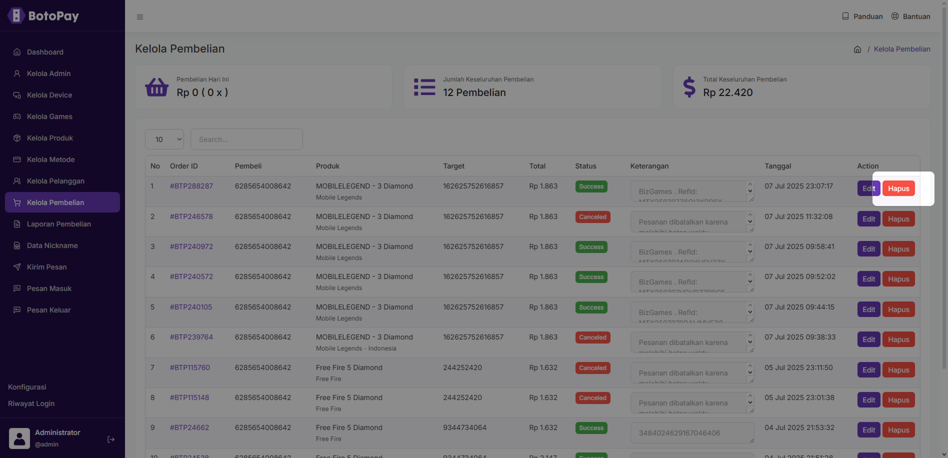 2. Klik “Hapus” pada kolom pembelian yang ingin kamu hapus.