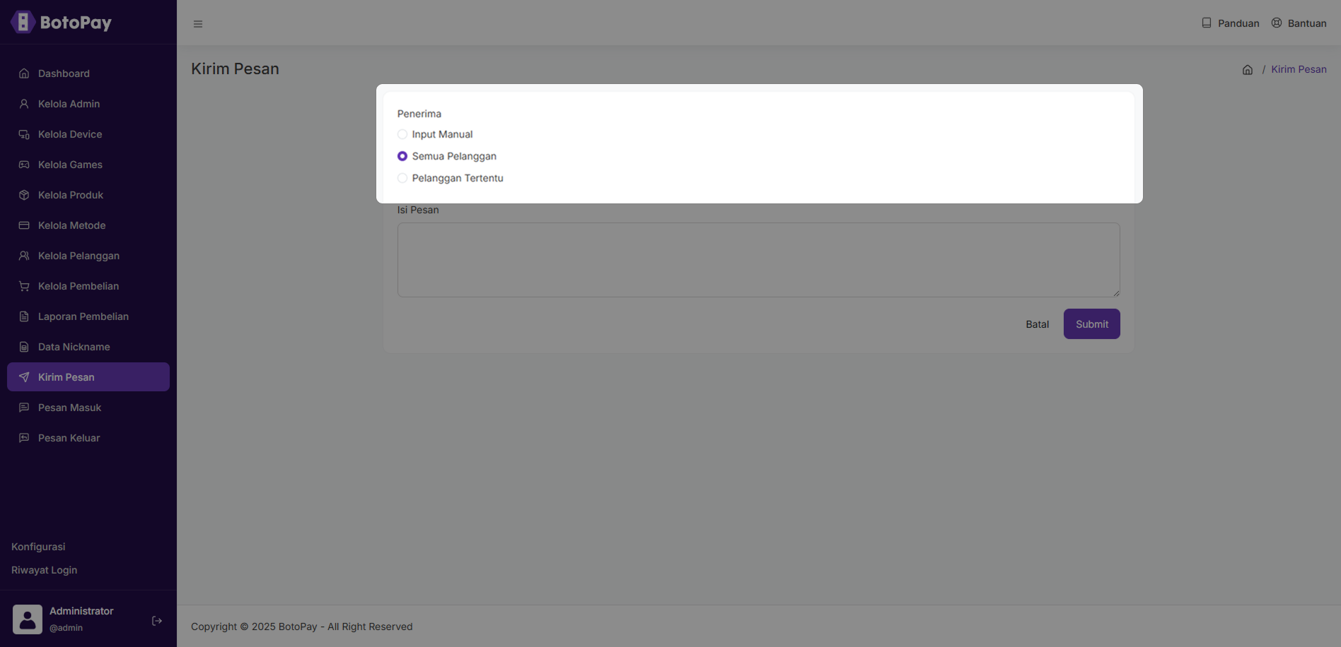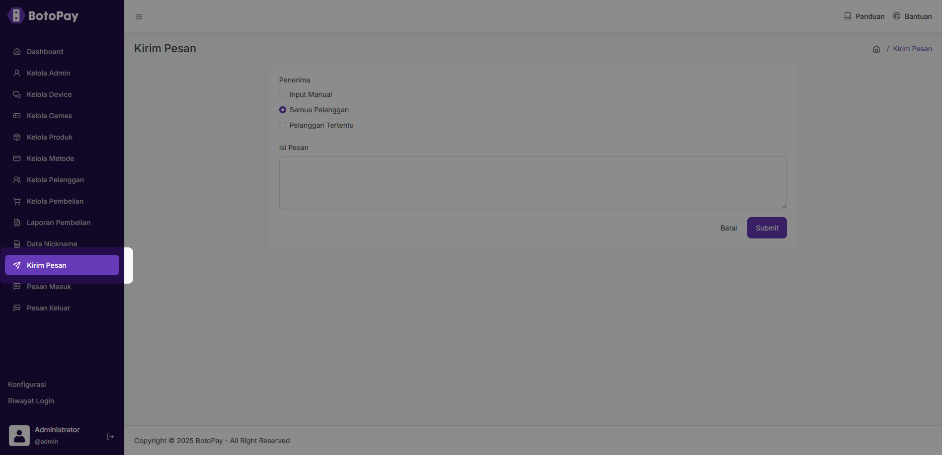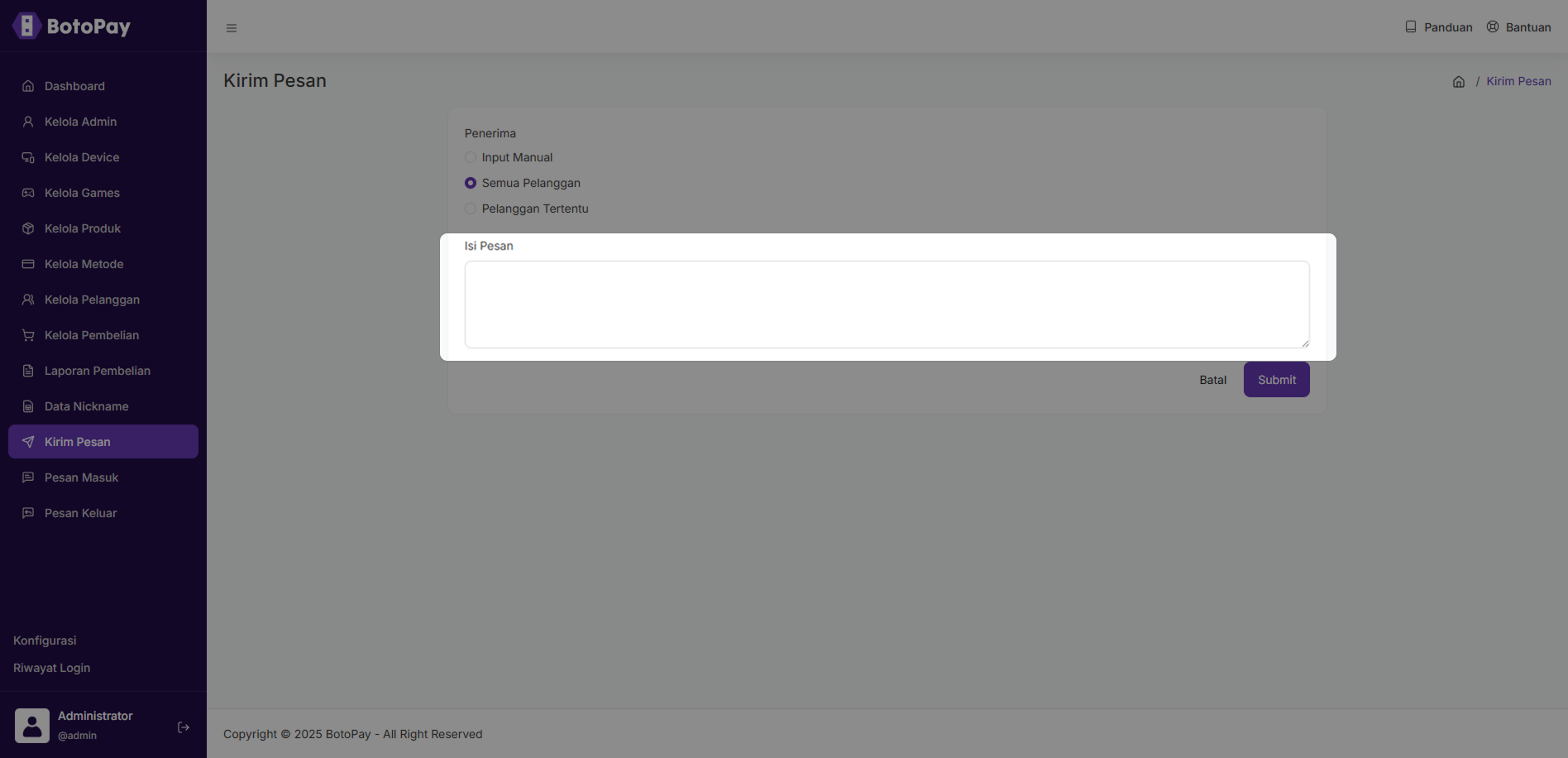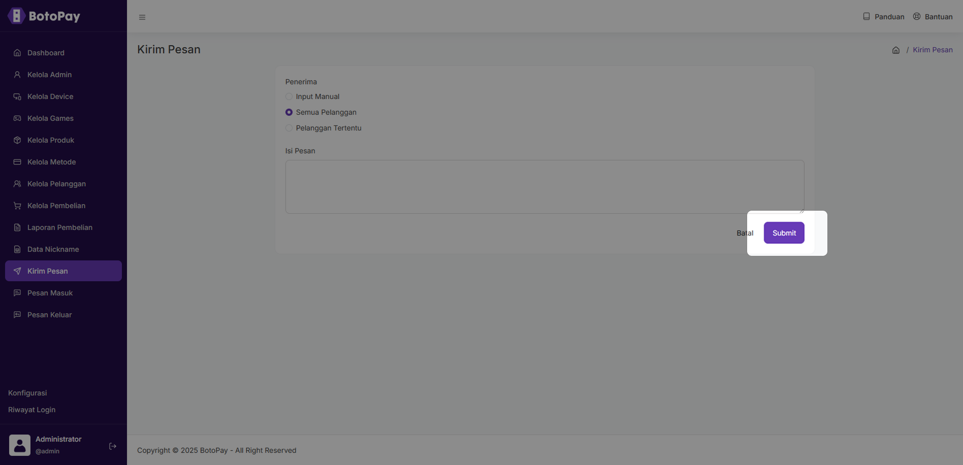 1. Pada halaman dashboard admin, klik “Kirim Pesan”.