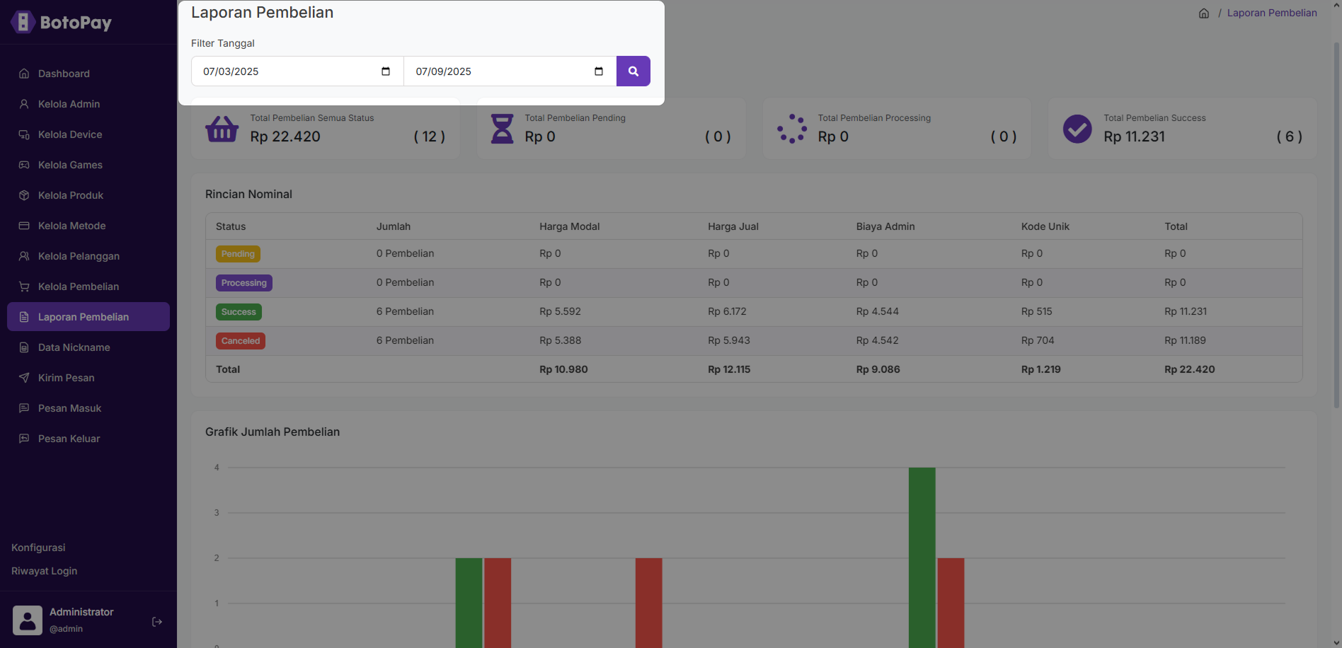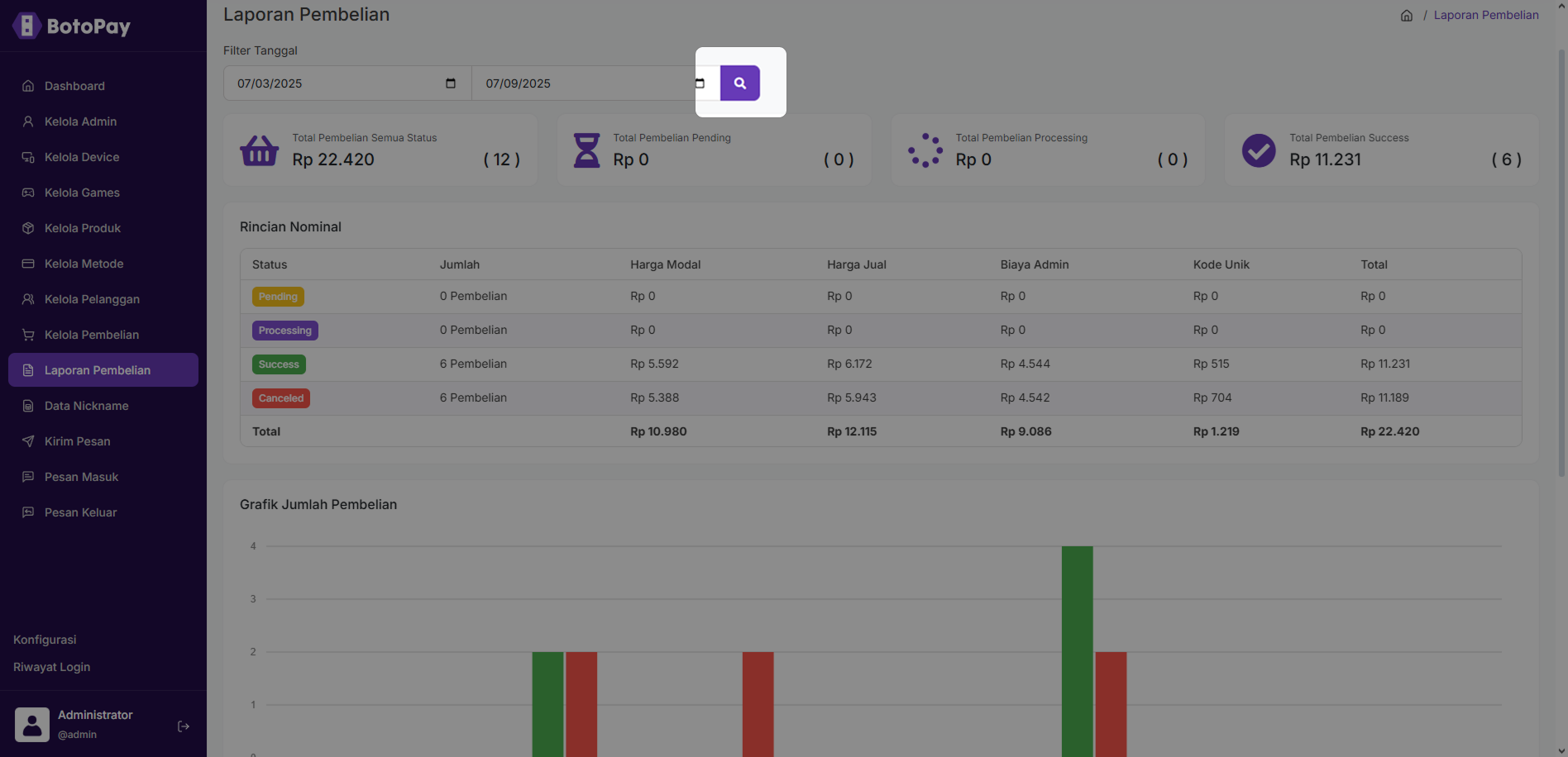 Berikut cara untuk melihat dan memfilter laporan pembelian : 1. Pada halaman dashboard admin, klik “Laporan Pembelian”. 2. Sesuaikan tanggal yang ingin kamu cari.