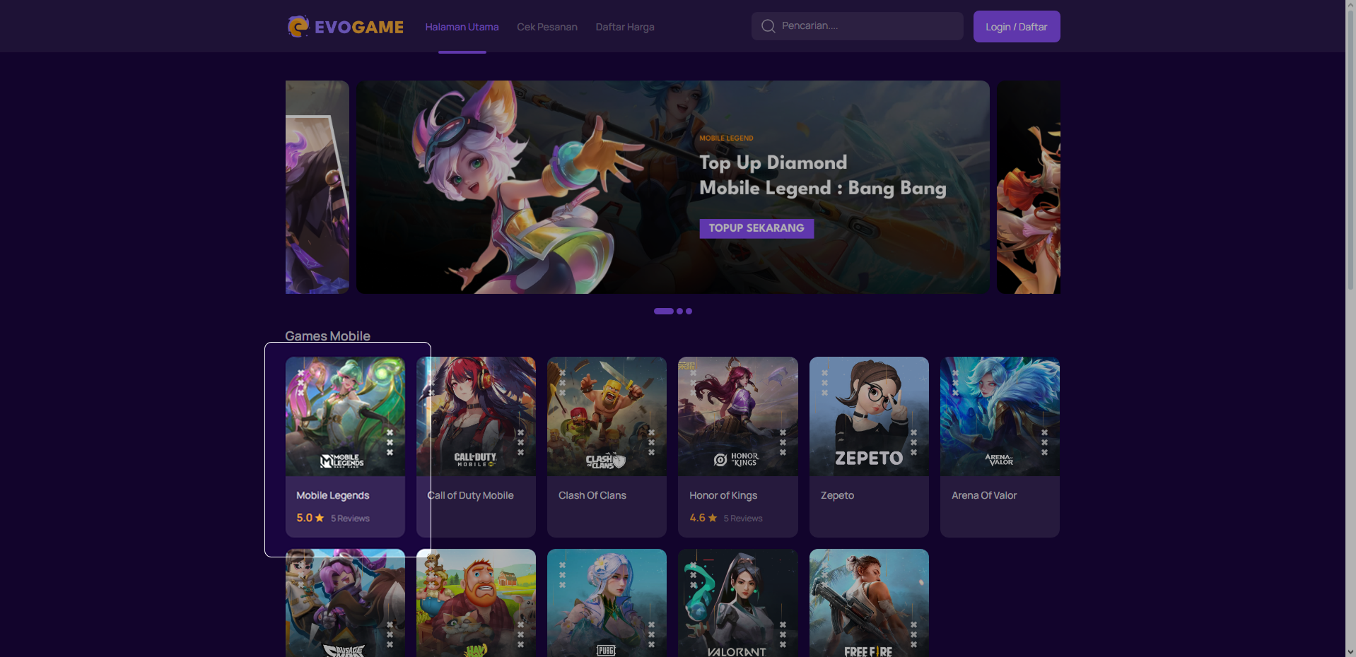 1. Pada halaman dashboard, pilih salah satu games yang ingin kamu topup.