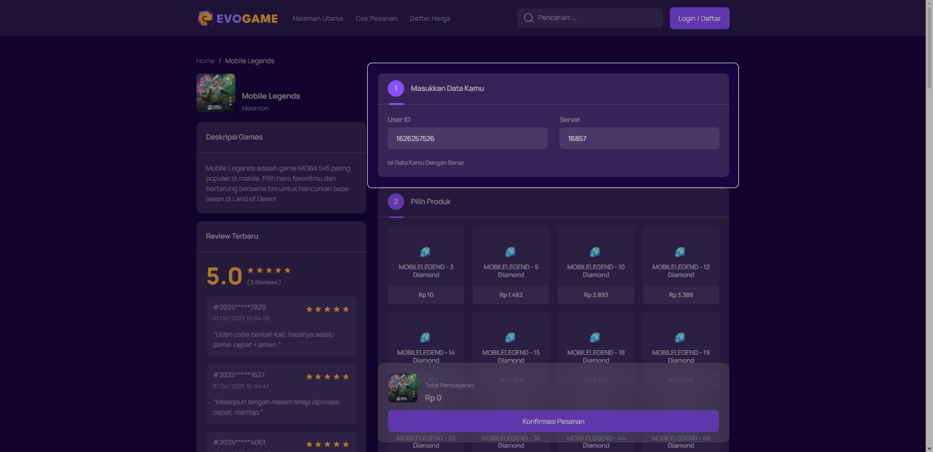 2. Masukan data games seperti User ID, Server, atau yang lainnya.