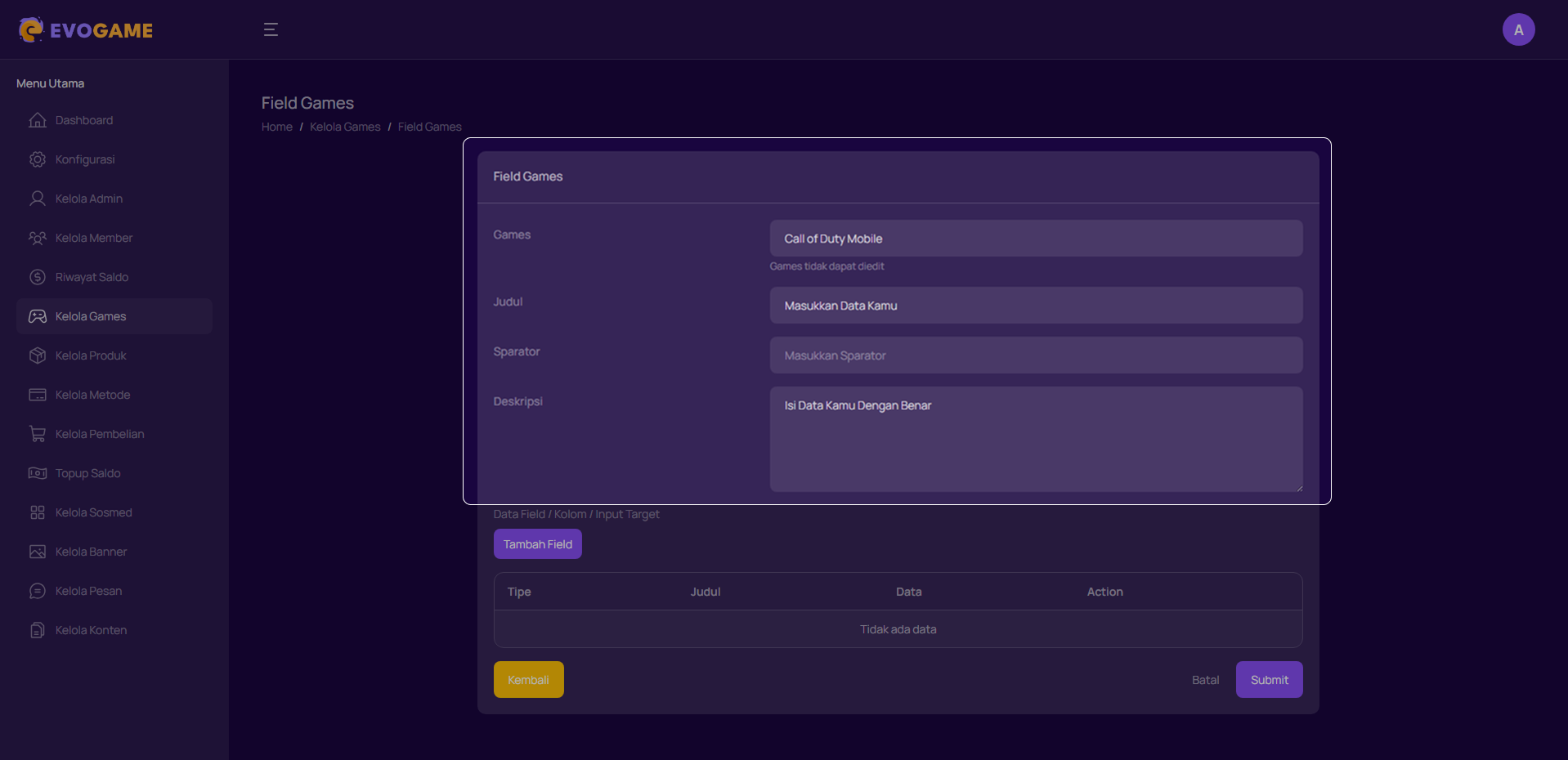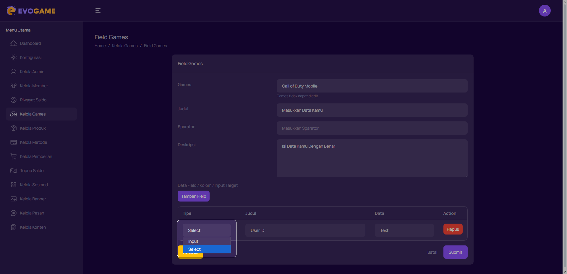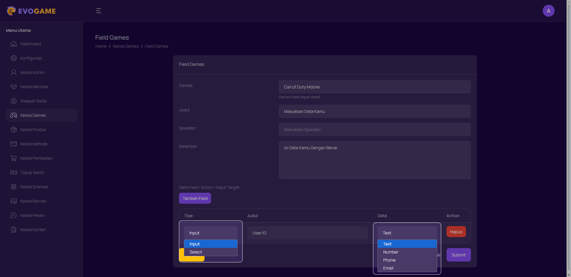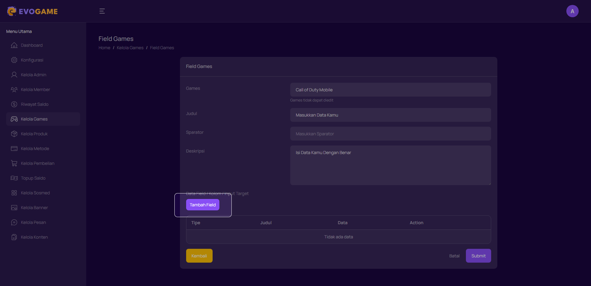 Field Games digunakan untuk menambahkan atau mengatur kolom input yang di butuhkan Pengguna saat melakukan topup pada game tertentu (Misalnya “User ID”, “Server”, dan lainnya).