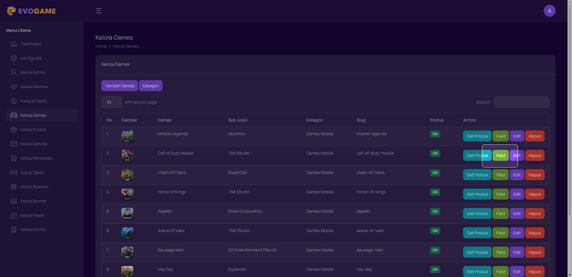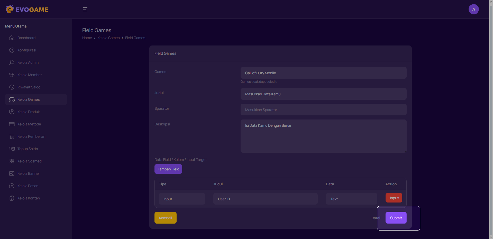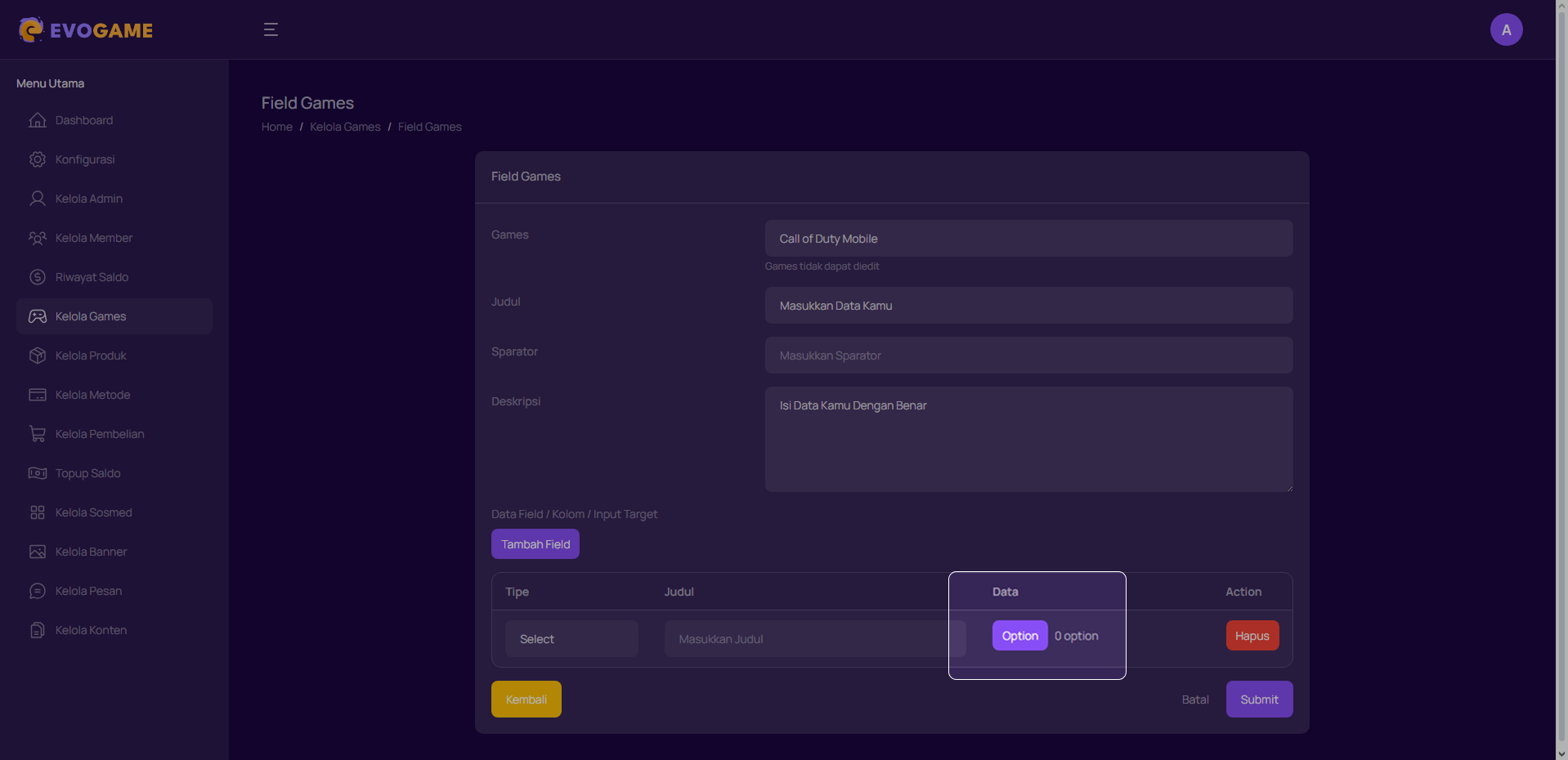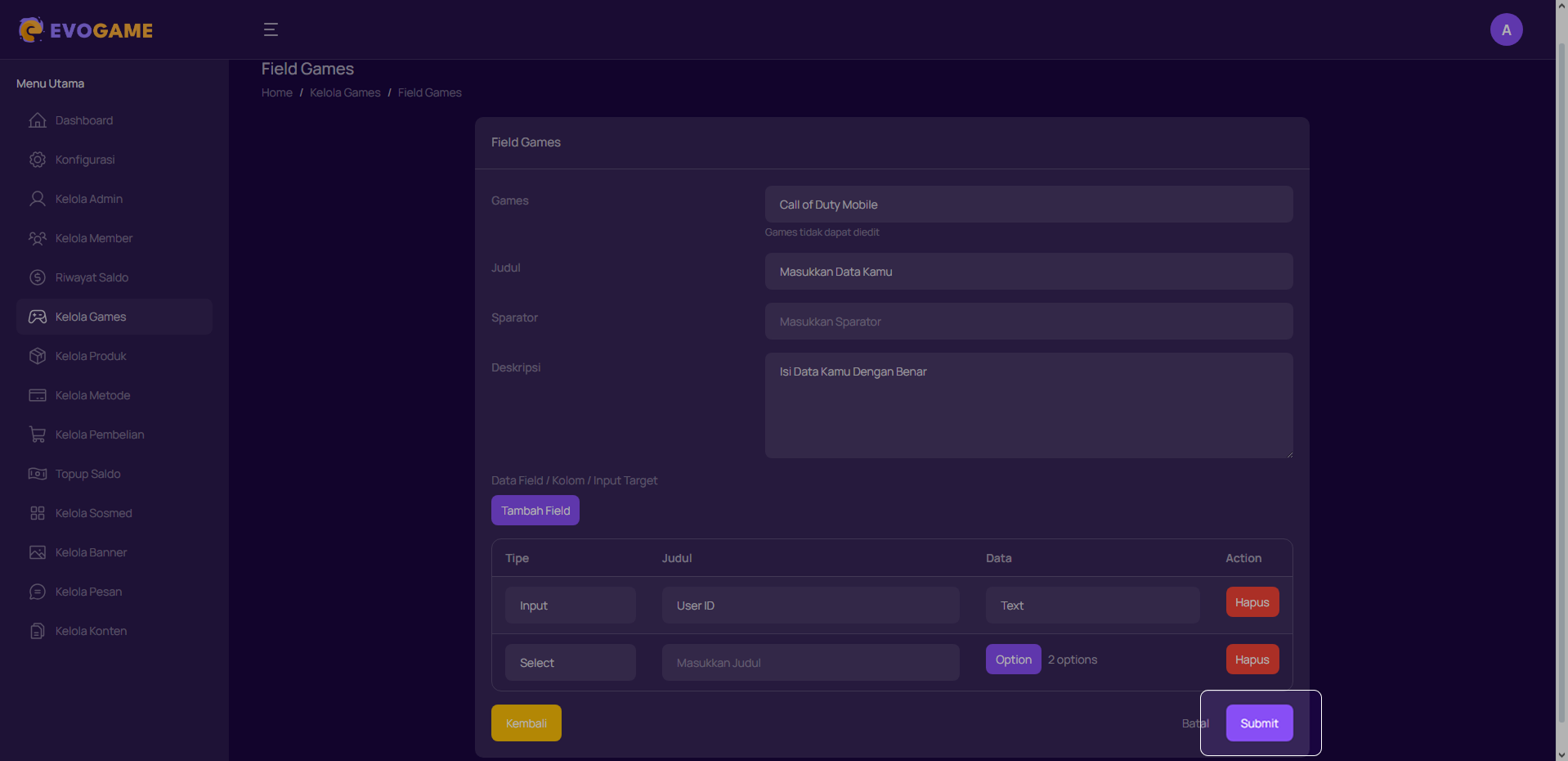 Field Games digunakan untuk menambahkan atau mengatur kolom input yang di butuhkan Pengguna saat melakukan topup pada game tertentu (Misalnya “User ID”, “Server”, dan lainnya).