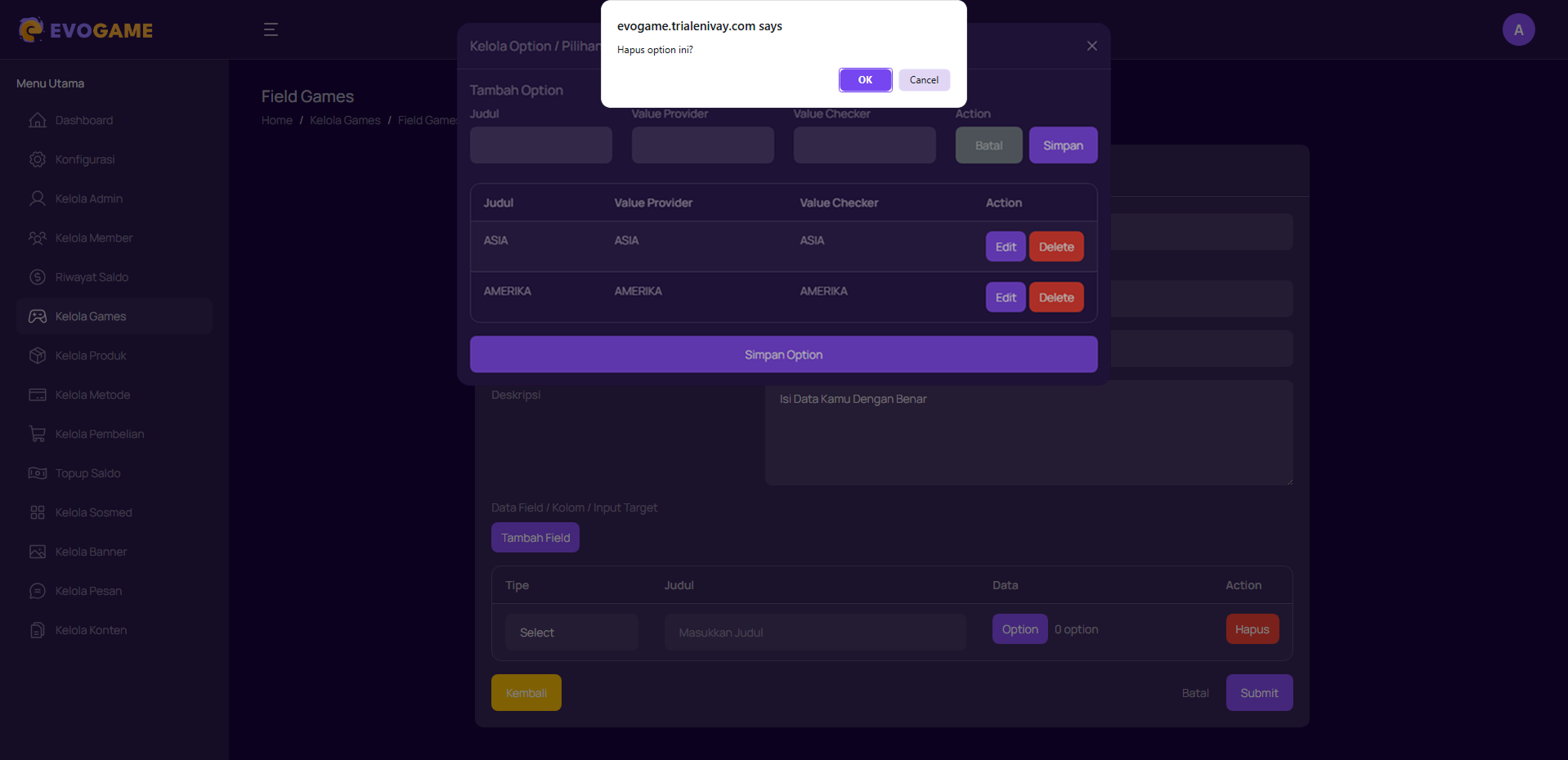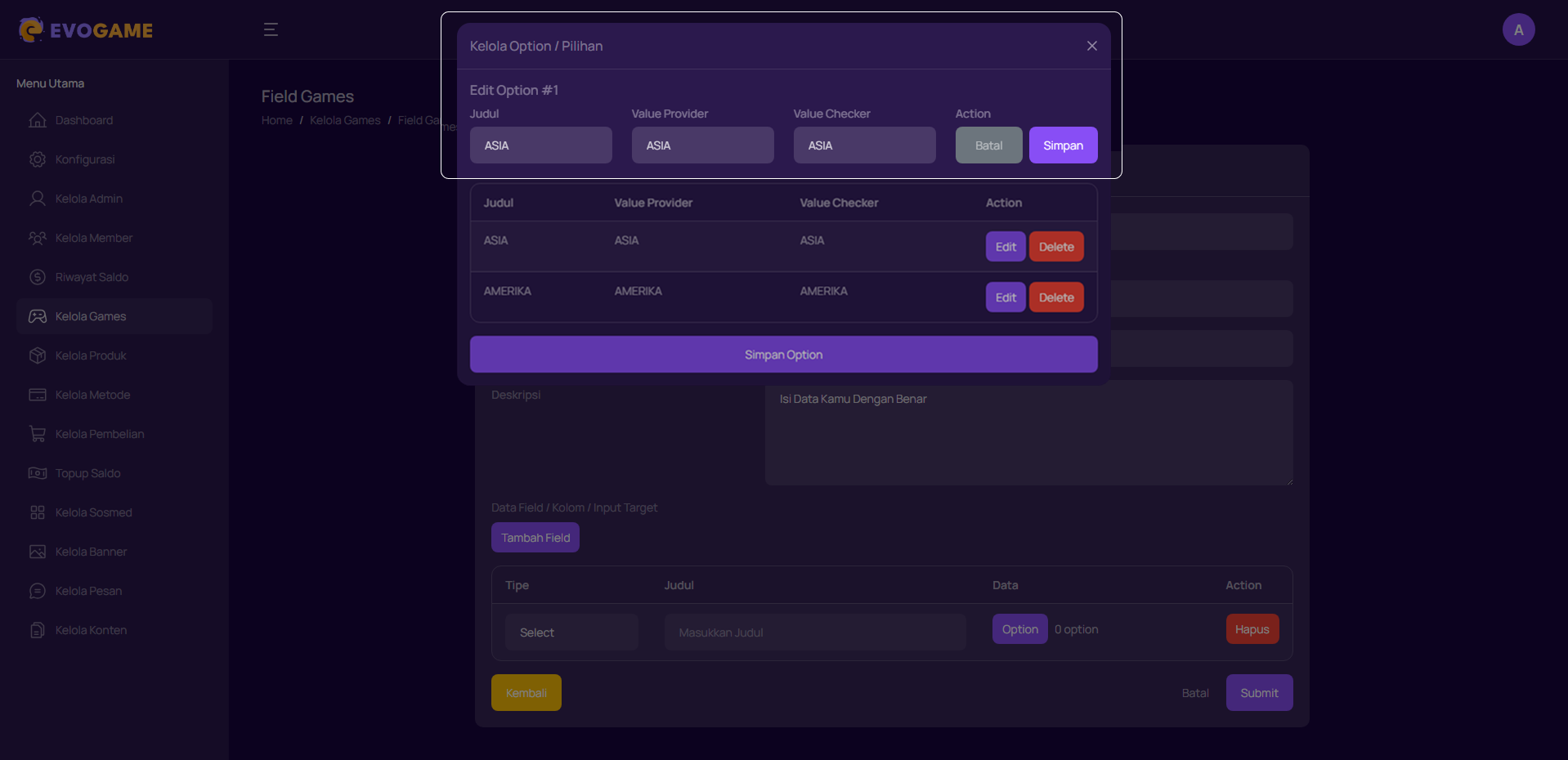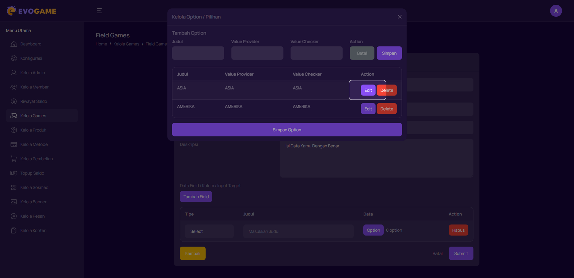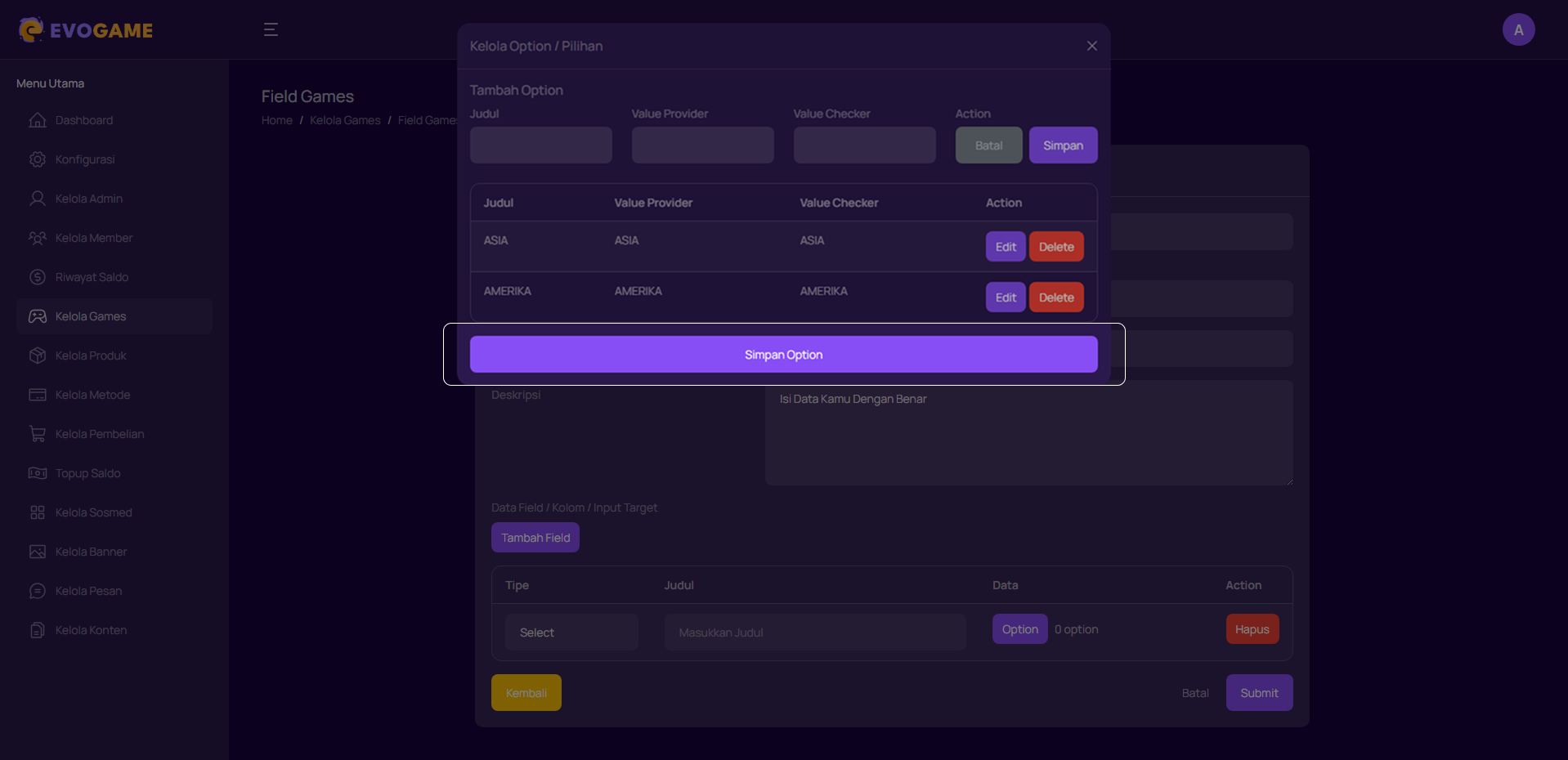 Field Games digunakan untuk menambahkan atau mengatur kolom input yang di butuhkan Pengguna saat melakukan topup pada game tertentu (Misalnya “User ID”, “Server”, dan lainnya).