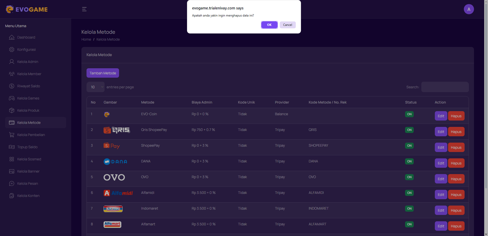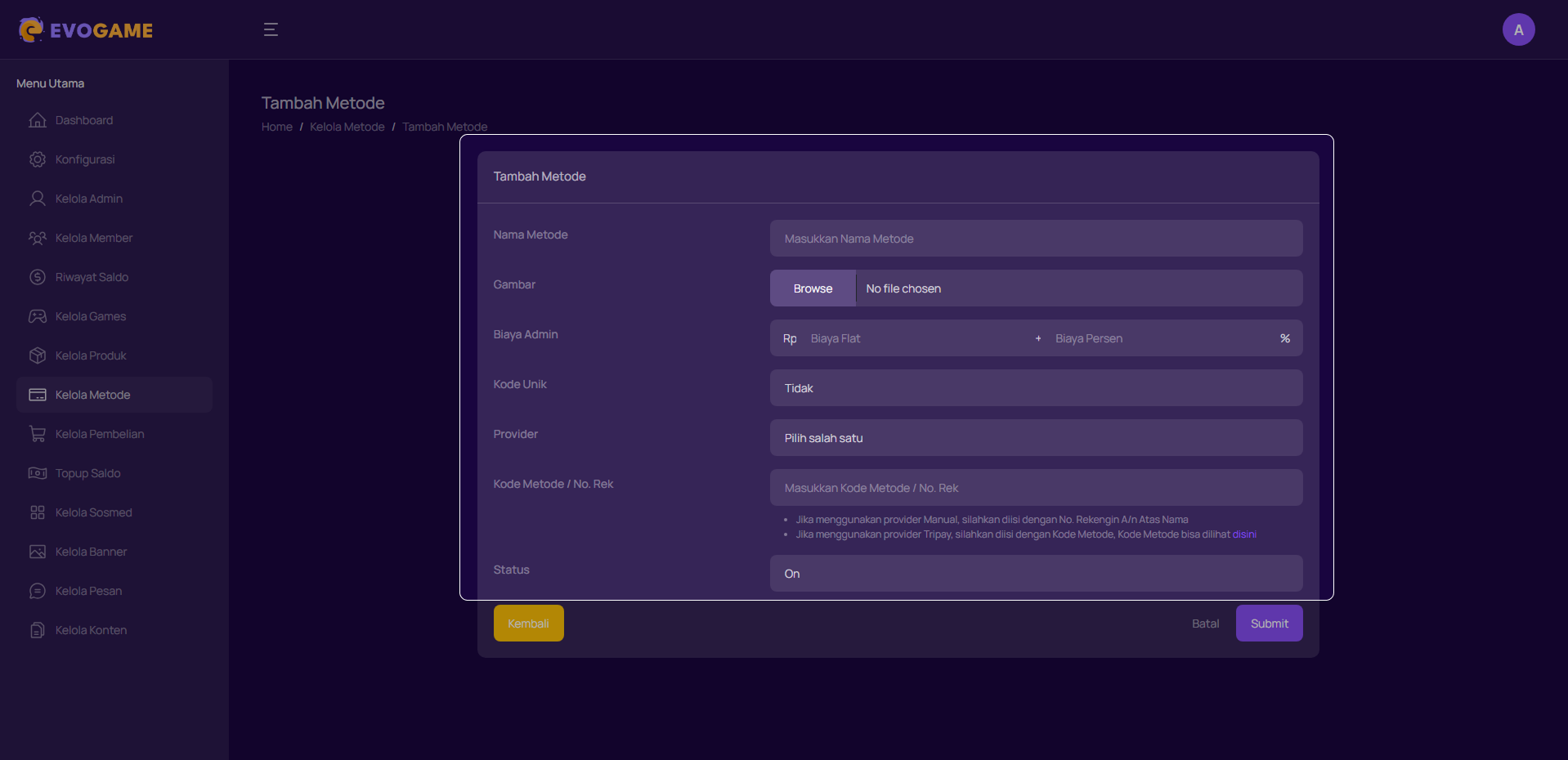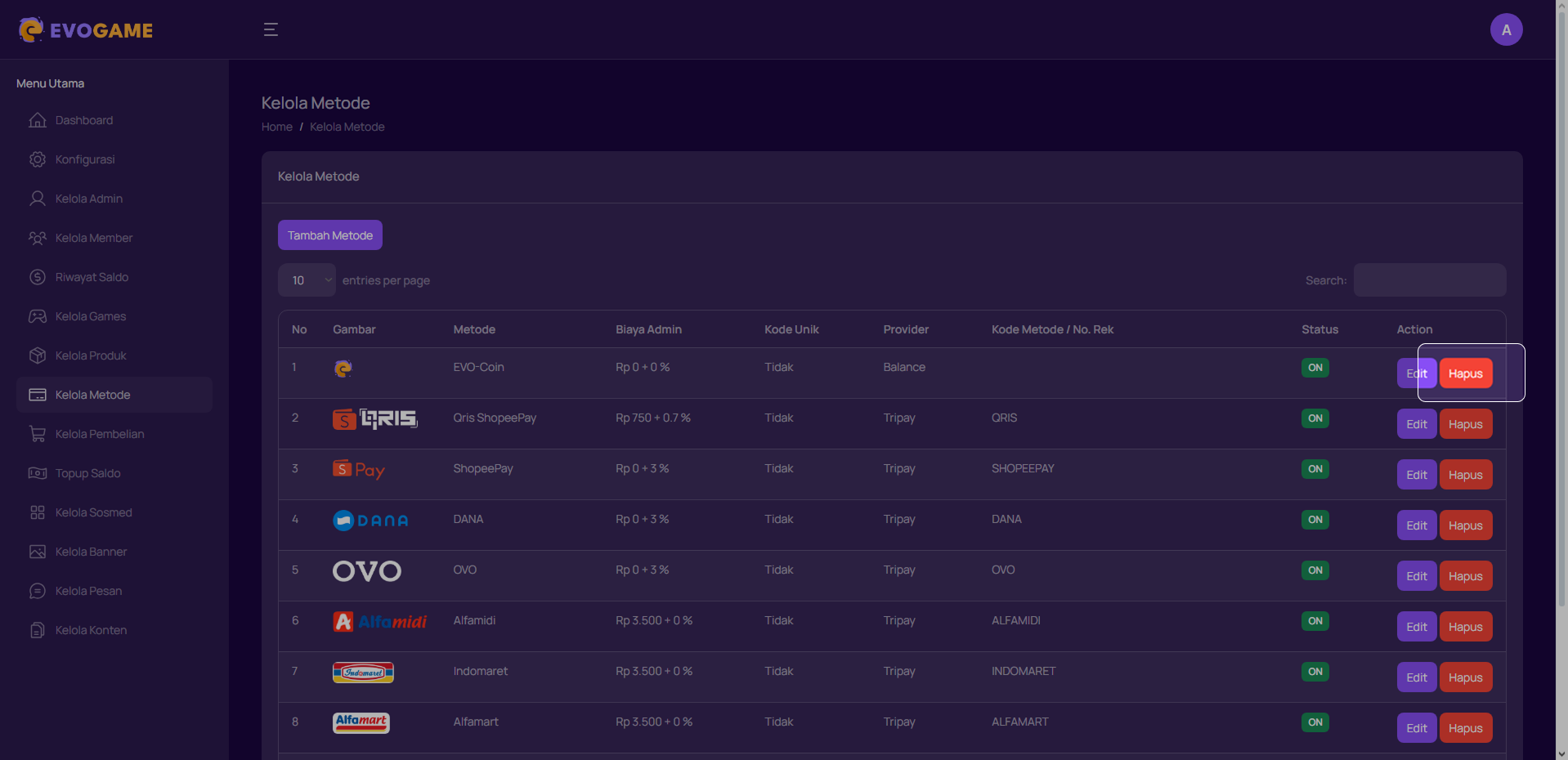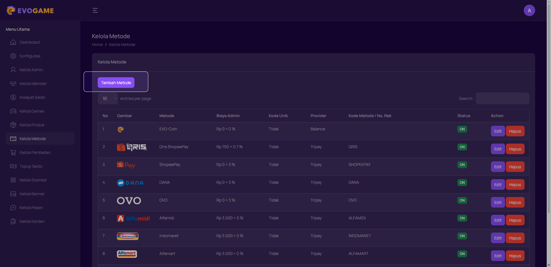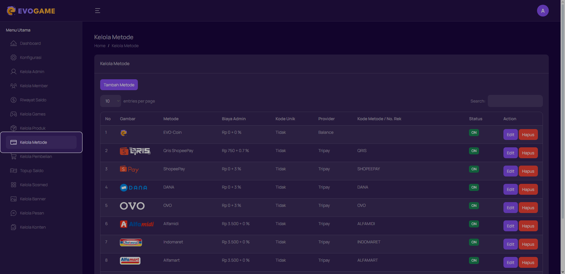 1. Klik “Kelola Metode” pada menu di sebelah kiri.