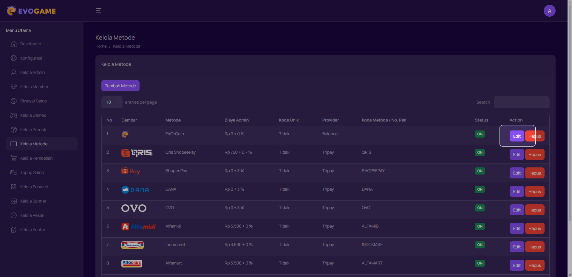 2. Pilih metode yang ingin kamu edit lalu klik “Edit”.