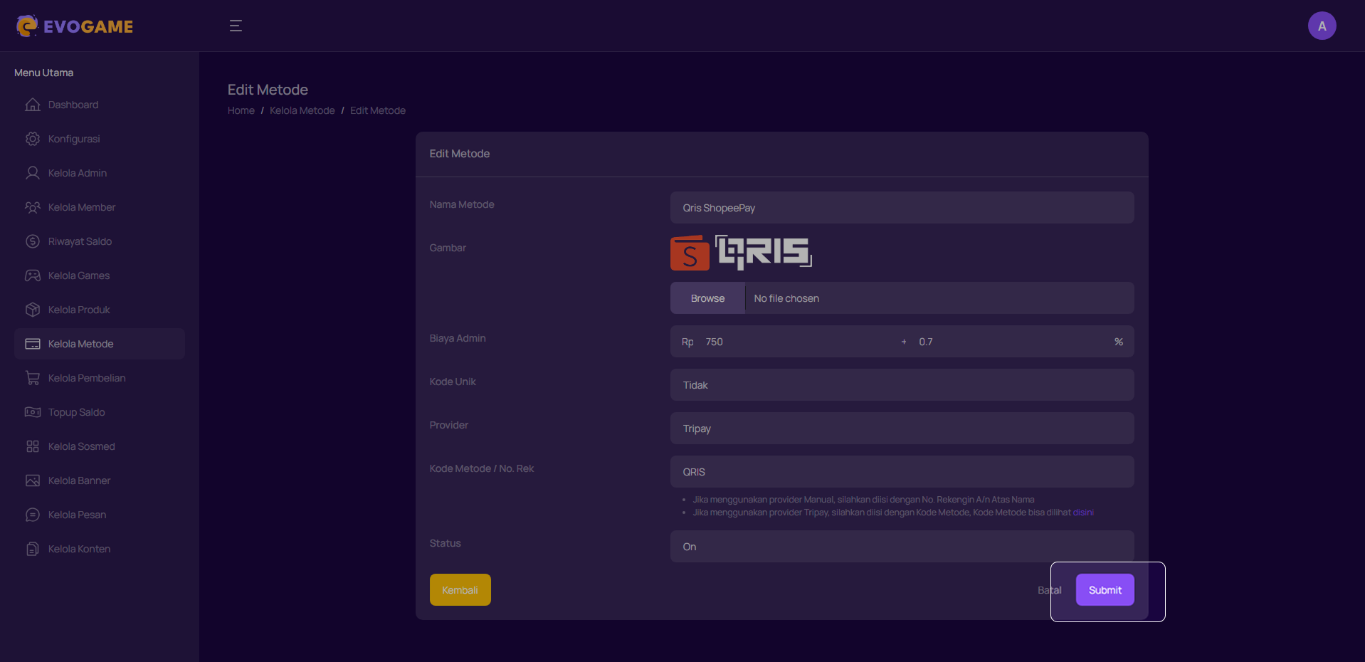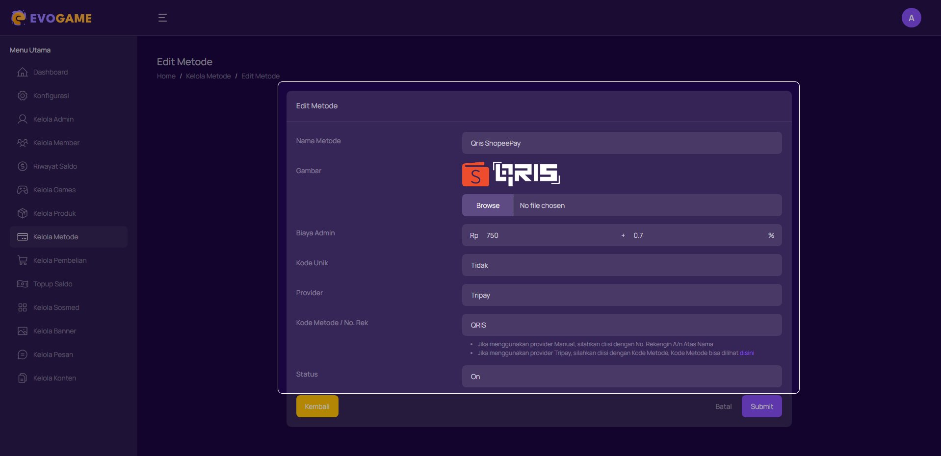 Bagian ini digunakan untuk memperbarui informasi metode Pembayaran yang sudah ada, misalnya saat mengganti biaya admin, provider, atau logo metode.