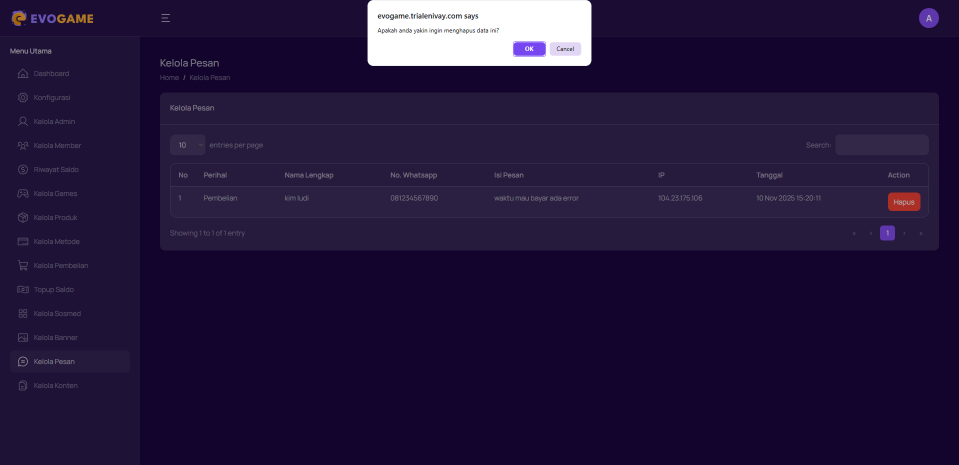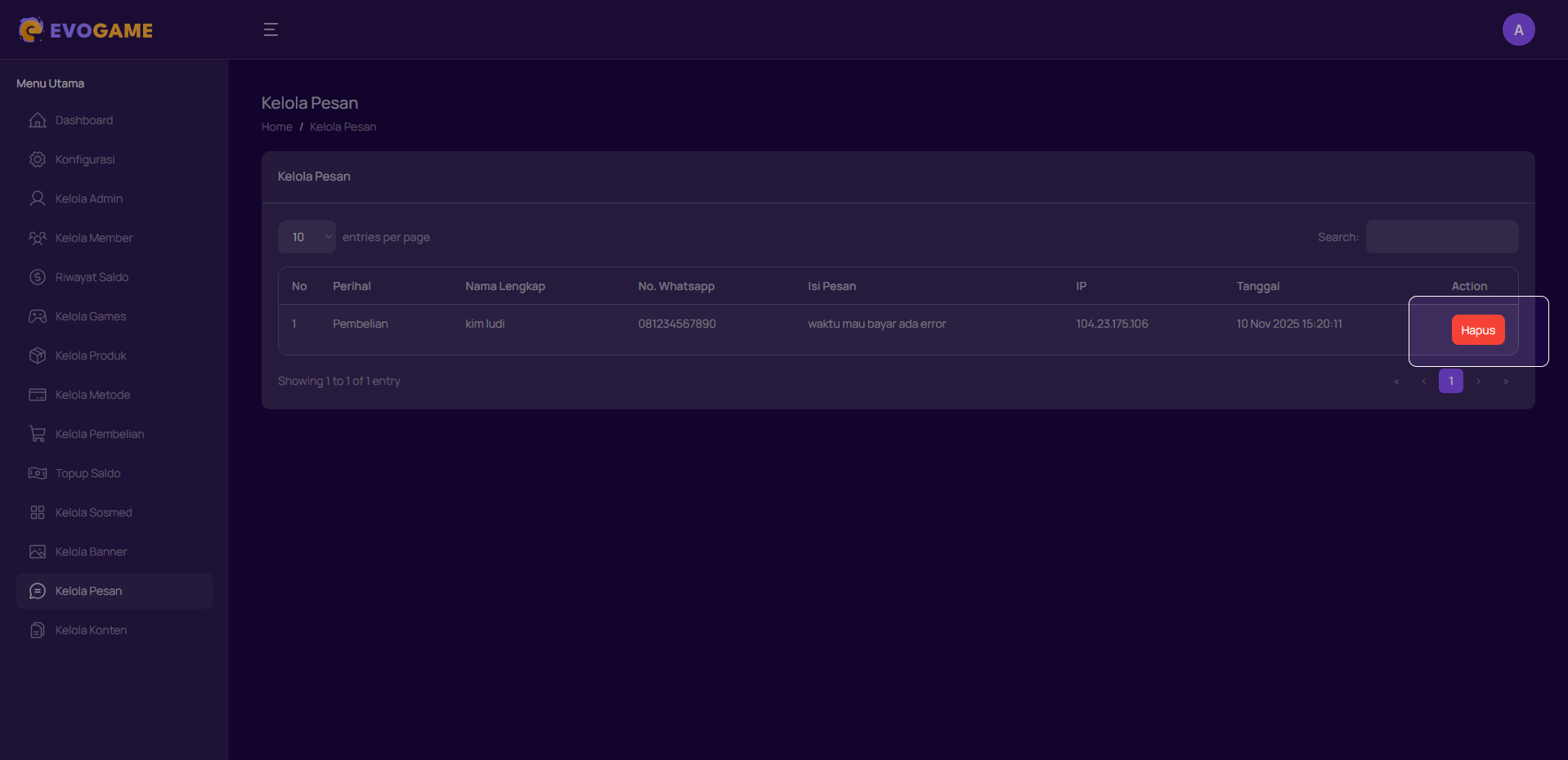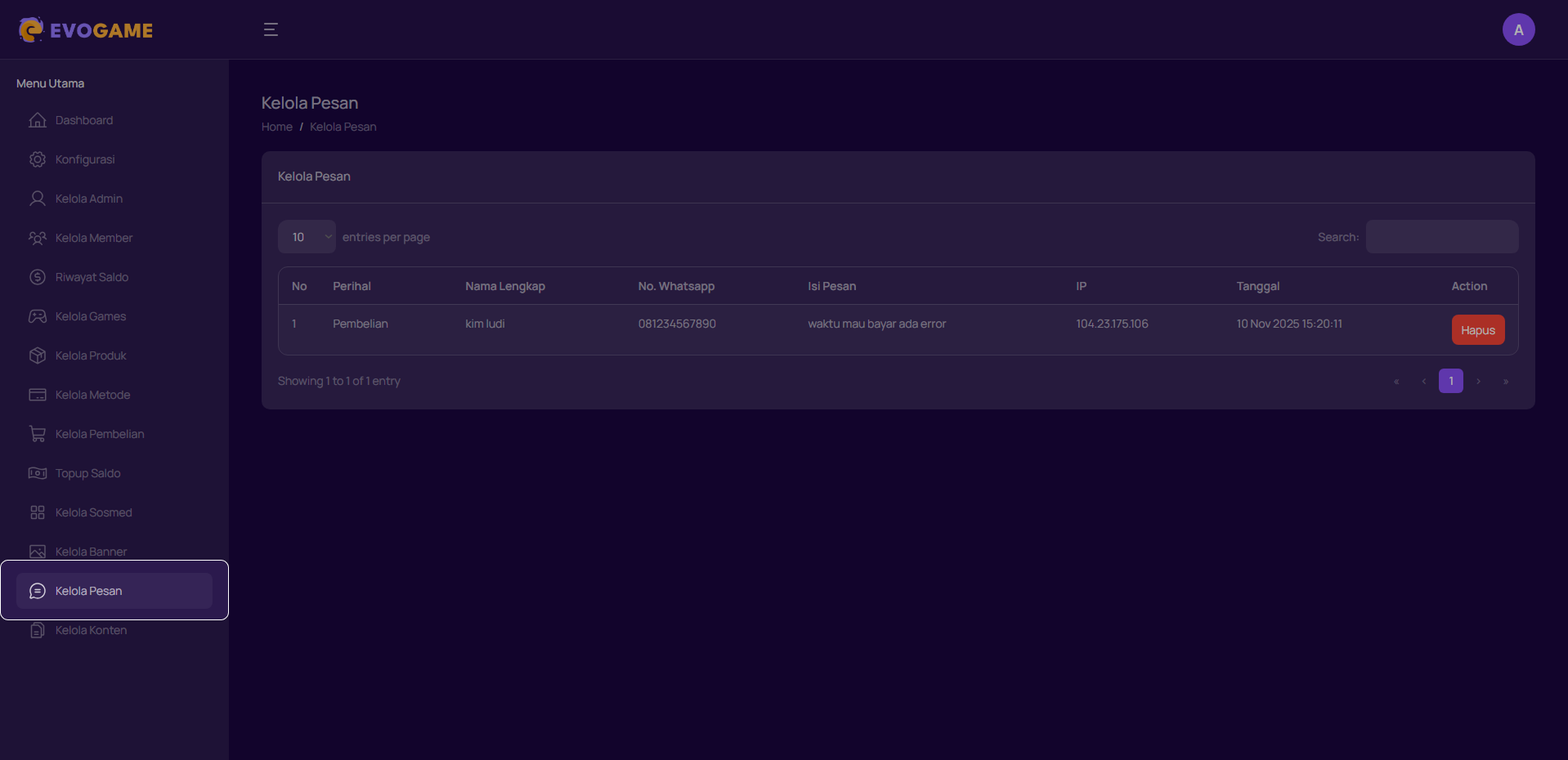 Halaman kelola pesan berfungsi untuk menampilkan semua pesan yang dikirim oleh Pengguna, seperti keluhan, complain, atau pertanyaan terkait pesanan, akun, reseller. Admin dapat melihat detail pesan dan melakukan respon langsung melalui WhatsApp.