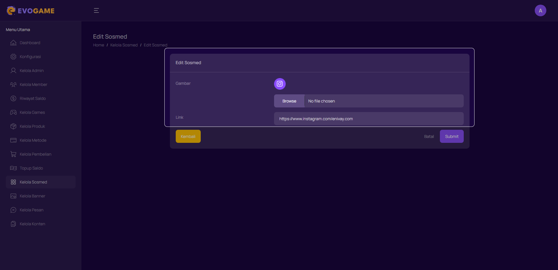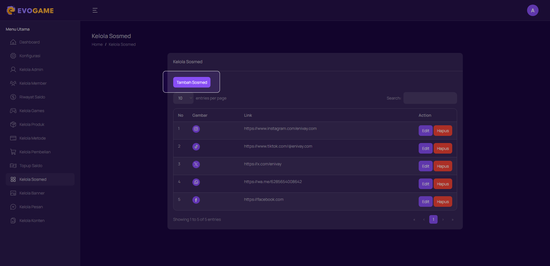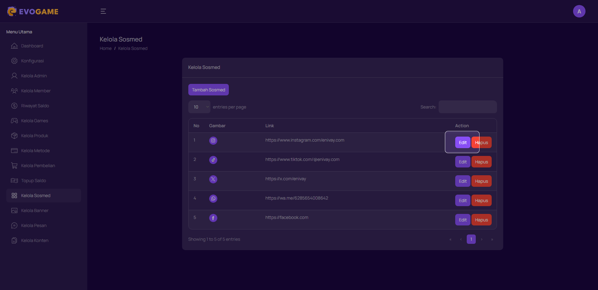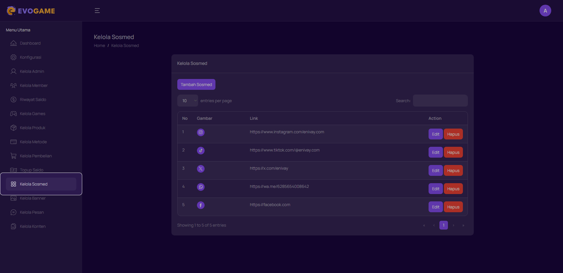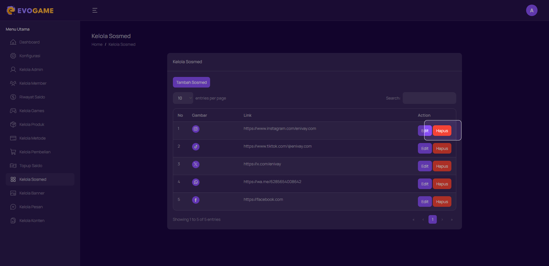 Kelola Sosmed digunakan untuk menambahkan, mengubah, atau menghapus layanan sosial media yang akan ditampilkan di halaman Pengguna.Admin dapat menambahkan ikon sosmed, mengganti link nya, atau menghapus.
