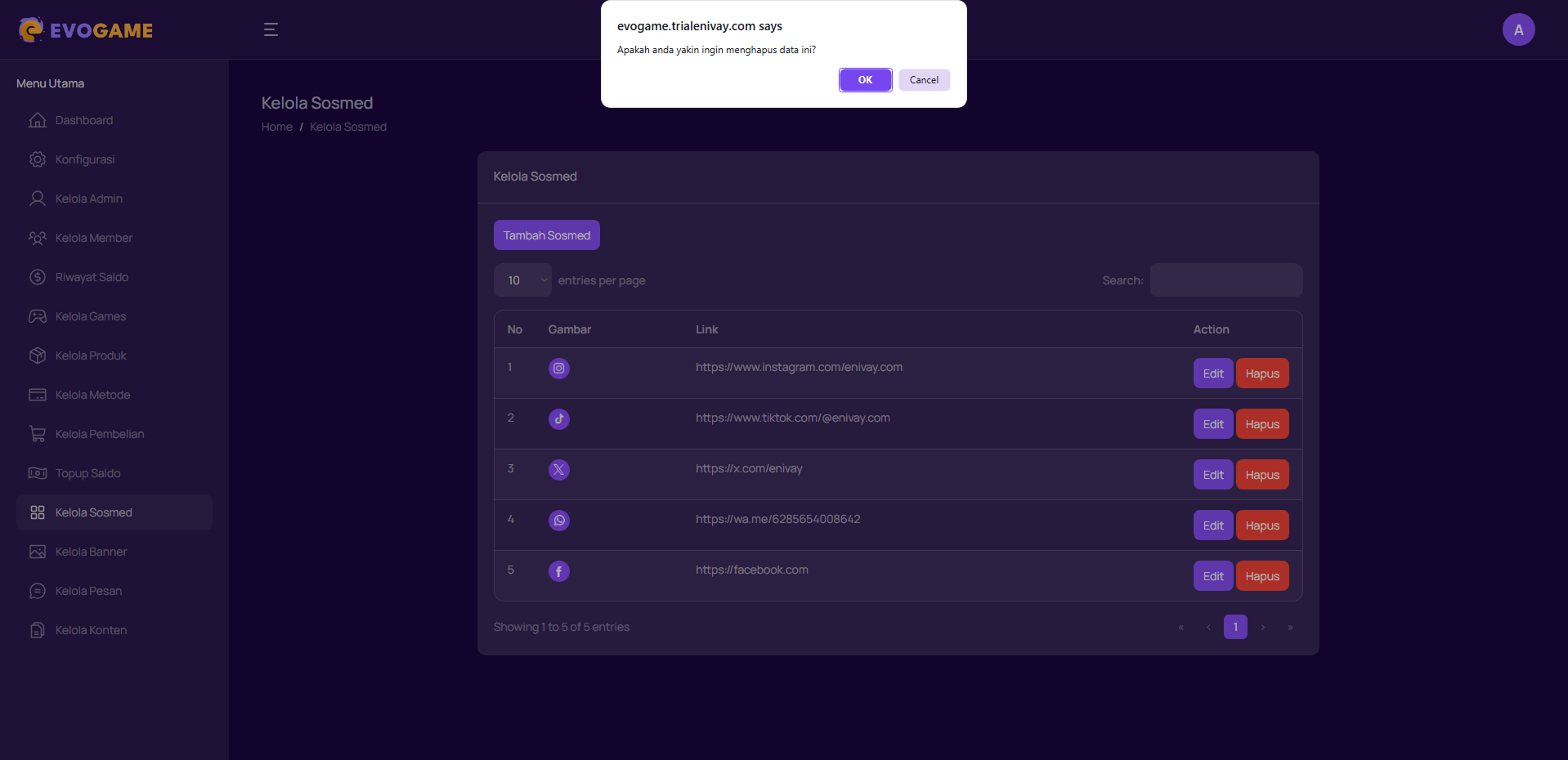 3. Akan muncul konfirmasi penghapusan, klik “OK” untuk menghapus social media secara permanen.