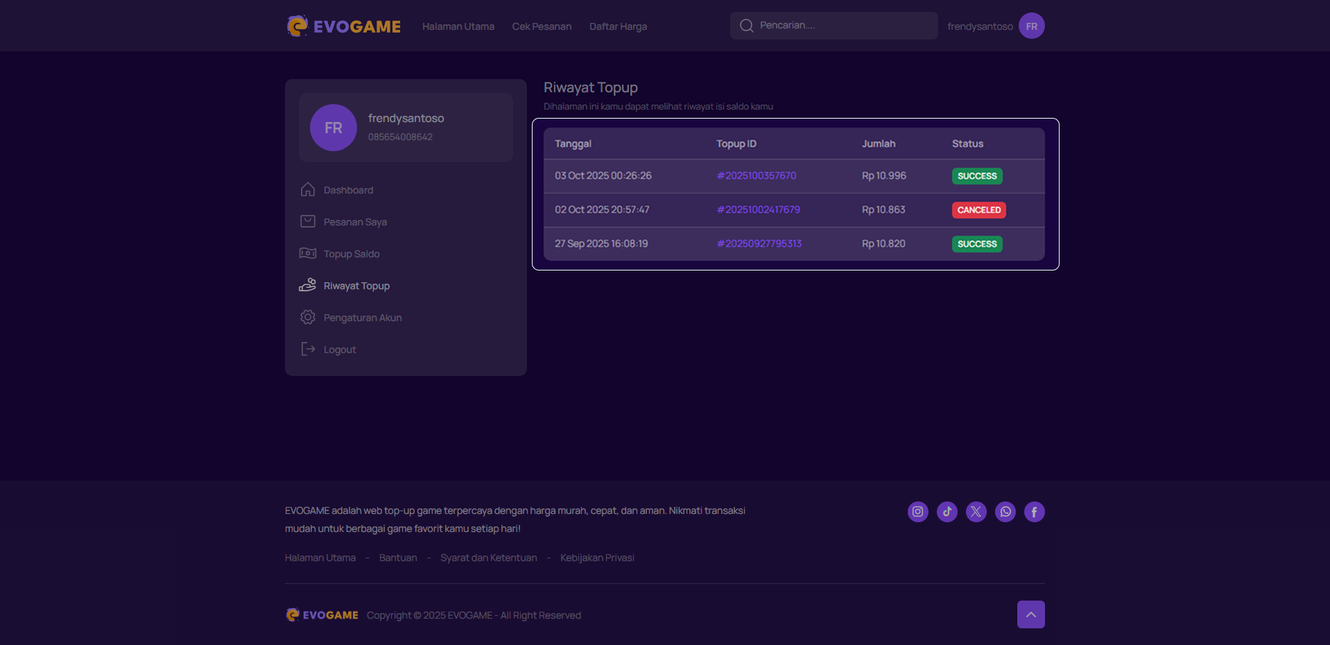 2. Klik menu “Riwayat Topup” pada halaman akun.
