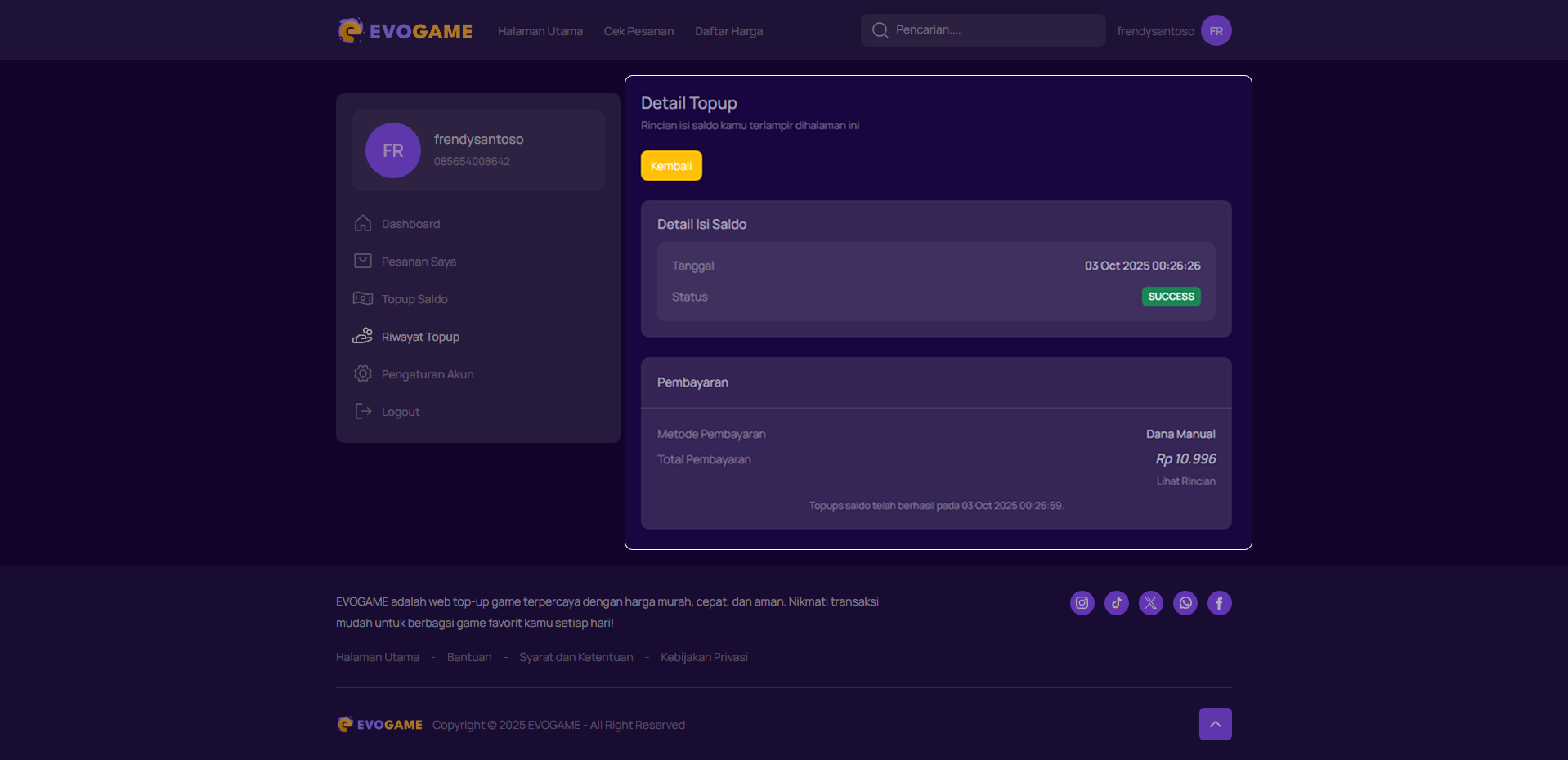 Fitur Riwayat Topup digunakan untuk melihat daftar pengisian saldo yang pernah kamu lakukan, termasuk status transaksi dan detail pembayaran.