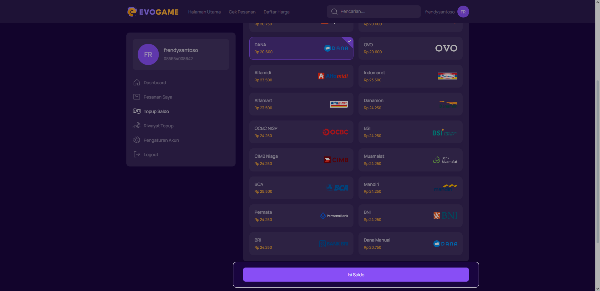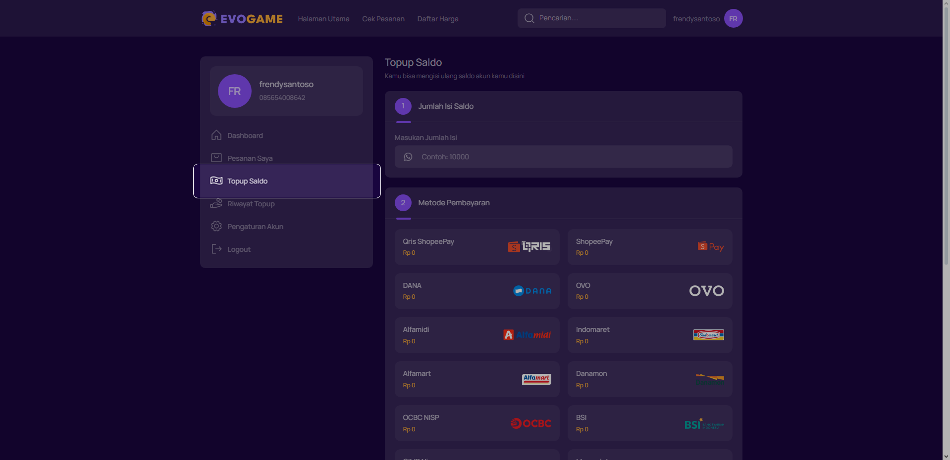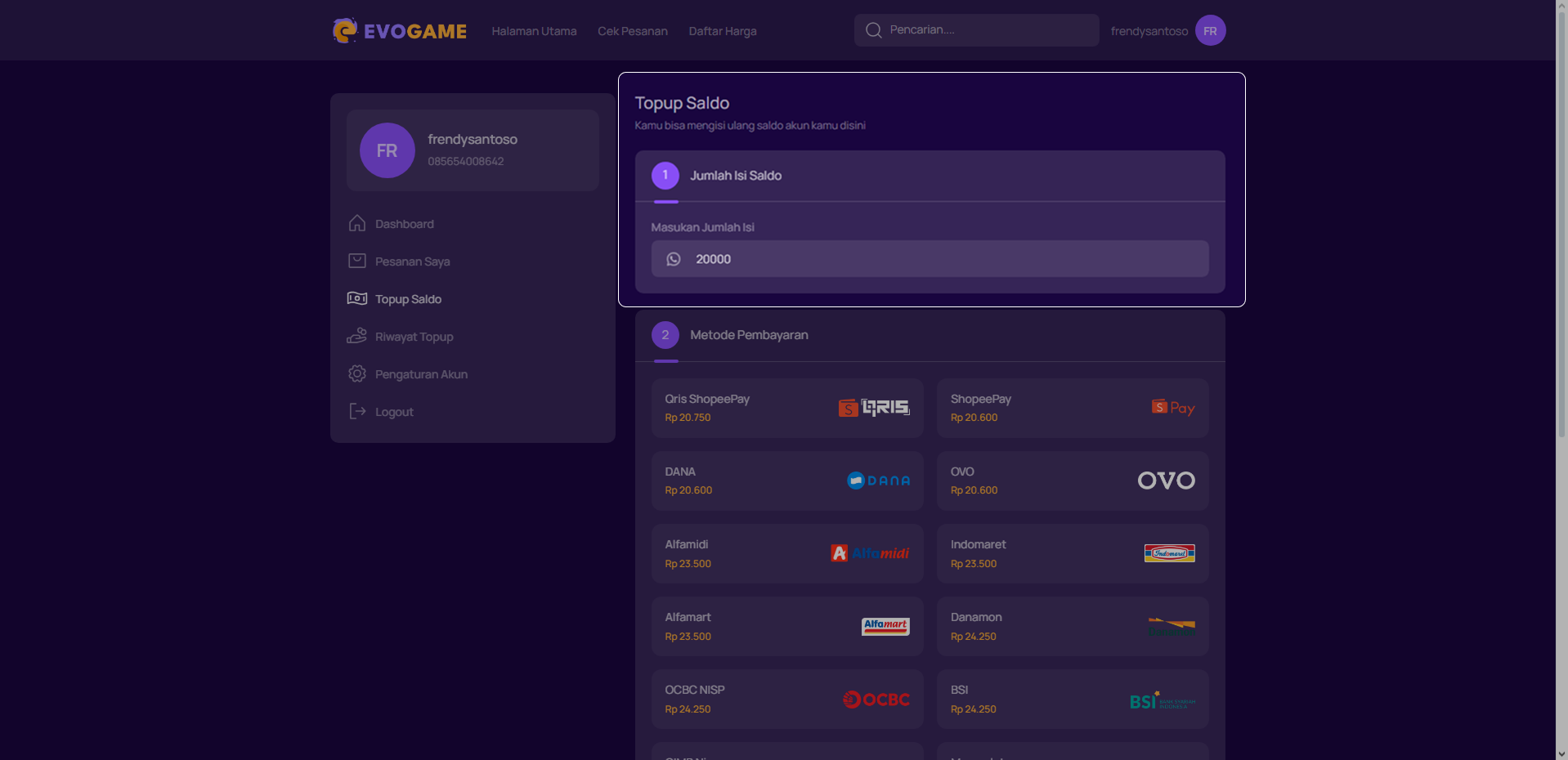 Fitur Topup Saldo digunakan untuk menambahkan saldo ke akun EvoGame agar kamu dapat melakukan pembelian dengan lebih cepat tanpa perlu melakukan pembayaran berulang kali.